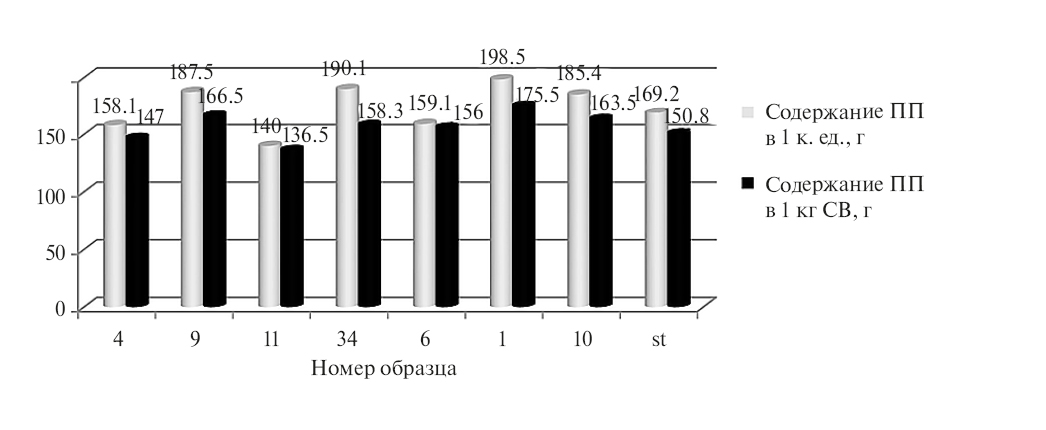 Среди изученных в 2021 г. генотипов (F2–F4) значительно превышают стандарт по содержанию ПП в 1 кг СВ гибридные образцы № 34 (Немчиновская юбилейная × Омичка 3) и № 1 (Луговская 85 × № 2252) – 190,1–198,5 г (рис. 3). Обеспеченность ПП 1 к. ед. у данных образцов превышала сорт Луговская 85 на 20,9–47,7 г.