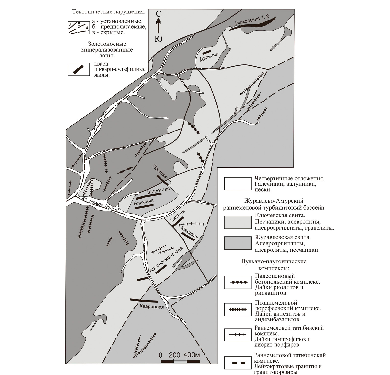 Месторождение Намовское входит в состав Малиновского рудного узла и является северо-восточным флангом Малиновского месторождения [13‒16, 18]. В региональном плане оно локализовано в переходной зоне между Евразиатским континентом и Тихоокеанской плитой [17, 33], в пределах зоны влияния Центрального Сихотэ-Алинского разлома. Последний представляет собой левосторонний сдвиг [34, 35]. Месторождение Намовское расположено в пределах Журавлевско-Амурского террейна, среди терригенных осадочных отложений журавлевской и ключевской свит (Белянский Г.С., 2011 г.). Весь комплекс осадочных образований смят в линейные складки северо-восточного простирания. Осадочные породы прорваны монцонитами Водораздельного интрузива татибинского диорит-гранитового комплекса, а также дайками пестрого состава и возраста (рис. 3). Основными разновидностями интрузивных пород являются габбро- и монцодиориты, реже отмечаются граносиениты и кварцевые сиенит-порфиры, которые встречаются в виде шлировидных выделений в монцодиоритах. Согласно U-Pb SHRIMP датам возраст интрузива составляет 105–103 млн лет [10]. Дайковые образования представлены маломощными телами диорит-порфиритов и лампрофиров (камптонитов) заключительной фазы татибинского комплекса.