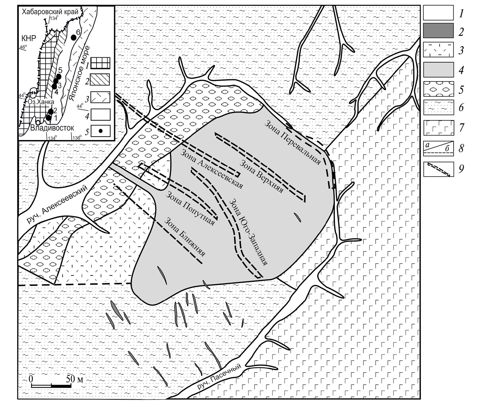 Рис. 4. Схематическая геологическая карта месторождения Пасечное (по материалам Углова В.В., 1981 г.): 1 – современные аллювиальные отложения; 2 – палеоцен-эоценовые дайки: кузнецовские базальты, андезибазальты, андезиты; 3 – юрско-меловые дациты, риодациты, риолиты и их туфы, конгломераты, песчаники, туфопесчаники и каменные угли; 4 – юрско-верхнемеловые экструзии, силлы риолитов; 5 – позднепермские конгломераты, конглобрекчии, песчаники, алевропесчаники, алевролиты, ястребовская свита; 6 – позднепермские конгломераты, песчаники, алевролиты, известняки, чандалазская свита; 7 – протерозойские амфиболитизированные габбро-гнейсы сергеевского комплекса; 8 – разрывные нарушения: а – установленные, б – предполагаемые; 9 – контуры рудных зон. На врезке фрагмент схемы террейнов Сихотэ-Алинского орогенного пояса и прилегающих территорий, по данным [20, 33]: 1 – Ханкайско-Буреинский кристаллический массив и его обрамление; 2 – Самаркинская аккреционная призма (турбидит-олистостромовая); 3 – Прибрежный вулканический пояс; 4 – Журавлевский – юг и Таухинский – север террейны; 5 – золоторудные месторождения (1 – Криничное, 2 – Пасечное, 3 – Малиновское, 4 – Глухое, 5 – Болотистое)