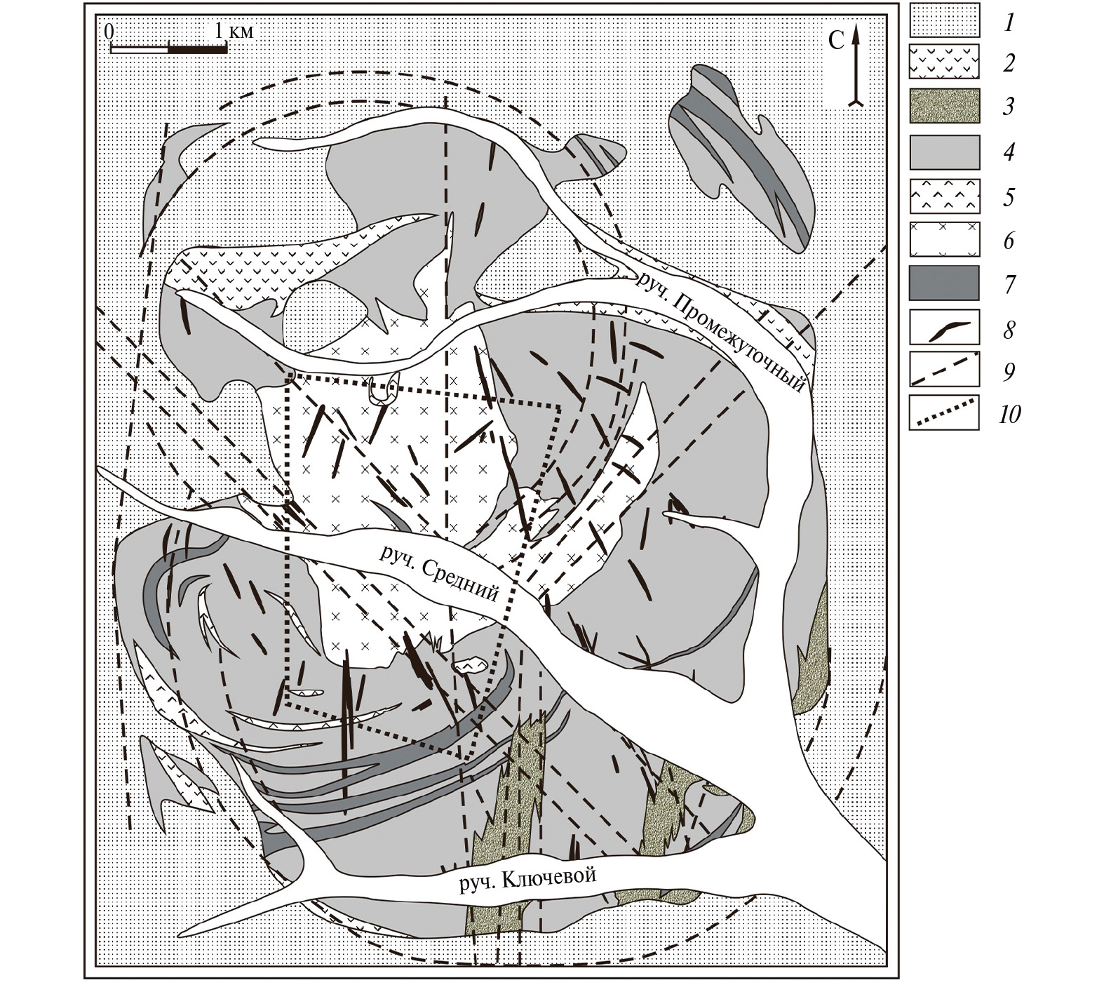 Рис. 6. Схематическая геологическая карта месторождения Болотистое (Дымович, 1981): 1 – базальты кизинской свиты, миоцен; 2 – андезиты и андезито-базальты кузнецовской свиты, эоцен; 3 – щебнисто-глинистые отложения эрозионно-тектонического вреза, палеоген; 4 – песчаники, реже алевролиты, аргиллиты, мел; 5–8 – эоценовый магматический комплекс: 5 – дациты, 6 – интрузия сложного состава (габбро, габбро-диабазы, диабазы, габбро-диориты, диориты, кварцевые диориты), 7 – силлы габбро-диоритовых порфиритов, гранодиоритов, 8 – дайки основного и среднего состава; 9 – разрывные нарушения; 10 – контур рудной зоны