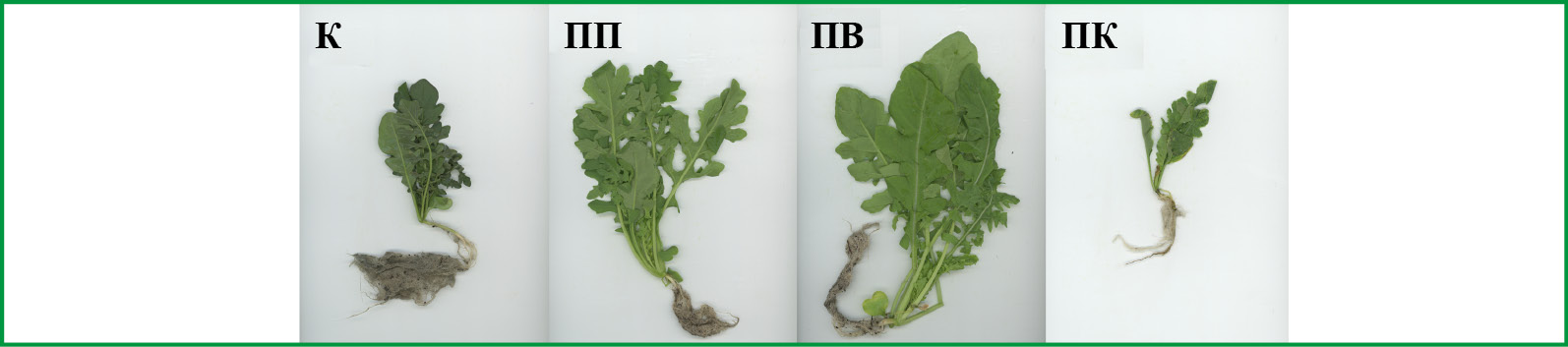 Применение различных почвенных смесей и добавок оказало значительное влияние на морфометрические характеристики, вес и показатели продуктивности растений руколы. На рисунке приведены фотографии руколы, культивировавшейся на разных почвенных смесях. В опытах с добавкой сапропеля все растения не смогли развиться, следовательно, значения их характеристик не могли быть оценены. Морфометрические характеристики руколы приведены в табл. 2. По всем характеристикам наилучший результат наблюдался в опыте ПВ в сравнении с контролем. Сопоставимый с опытом ПВ результат по всем характеристикам наблюдался в опыте ПП. Наименьший результат отмечен в опыте ПК.