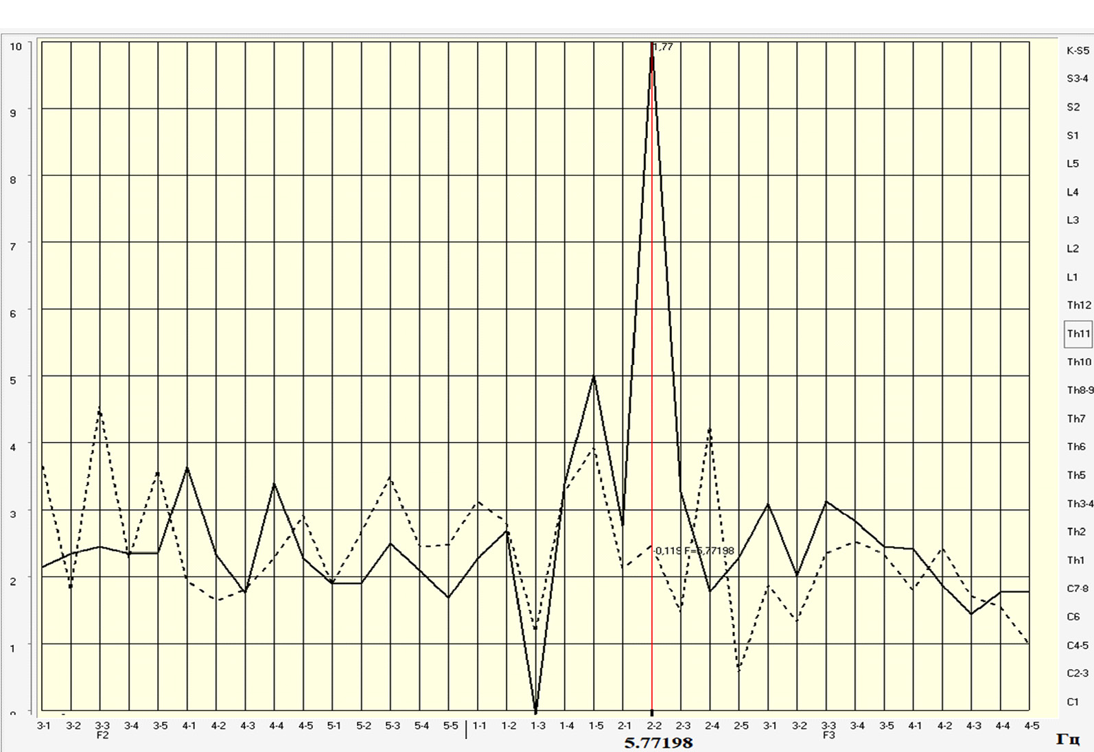 Регистрация спектра микровибраций происходила в затемненной удаленной от посторонних шумов комнате по стандартной методике, разработанной для спектрального анализатора акустоэнцефалограммы человека РС-АЭГ-01 [22, 23]. Зарегистрированный датчиками электрический сигнал механических микровибраций листа подвергался спектральному анализу в частотном диапазоне от 0,1 до 27 Гц. В результате на выходе анализатора спектра получали 8400 спектральных гармоник. Для выделения длительно текущих ритмических процессов было выбрано оптимальное время интегрирования 160 с, что составляло 1 кадр анализируемого спектрального массива информации. Точность определения спектральных гармоник до пятого знака после запятой обеспечивал рубидиевый стандарт частоты Ч1-1013. Большое время интегрирования позволяло уменьшить влияние паразитных спектральных гармоник и повысить точность, надежность и воспроизводимость результатов исследований.