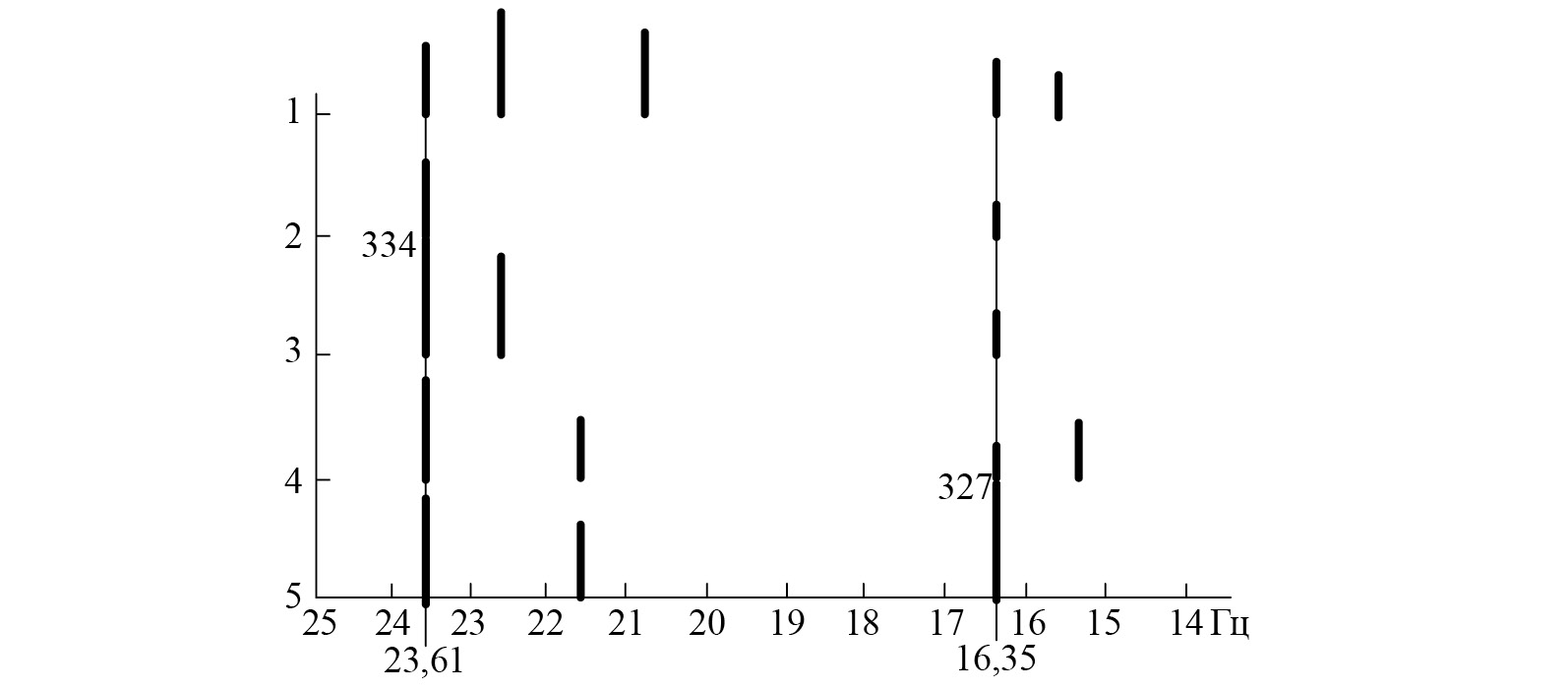 Видно, что вибрационные сигналы на частотах 23,61 и 16,35 Гц стабильно сохраняются в результате многоразовых повторений измерений.