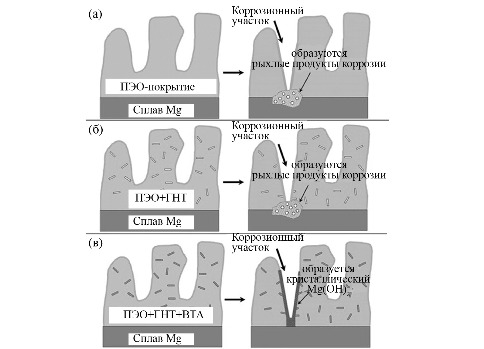 Рис. 1. Механизм коррозионной деградации и защитного действия покрытий на сплаве магния AM50 в растворе NaCl: (а) базовое ПЭО-покрытие, (б) ПЭО+ГНТ – ПЭО + галлуазитные нанотрубки, (в) ПЭО+ГНТ+BTA – ПЭО + галлуазитные нанотрубки + бензотриазол[40]