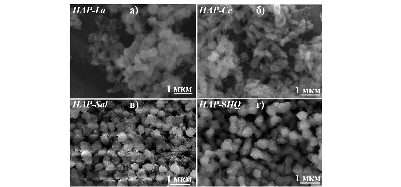 Рис. 2. СЭМ-изображения микрочастиц гидроксиапатита (HAP), обработанных ингибиторами: (а) La3+, (б) Ce3+, (в) cалицилальдоксим (Sal), (г) 8-оксихинолин (8HQ) [42]