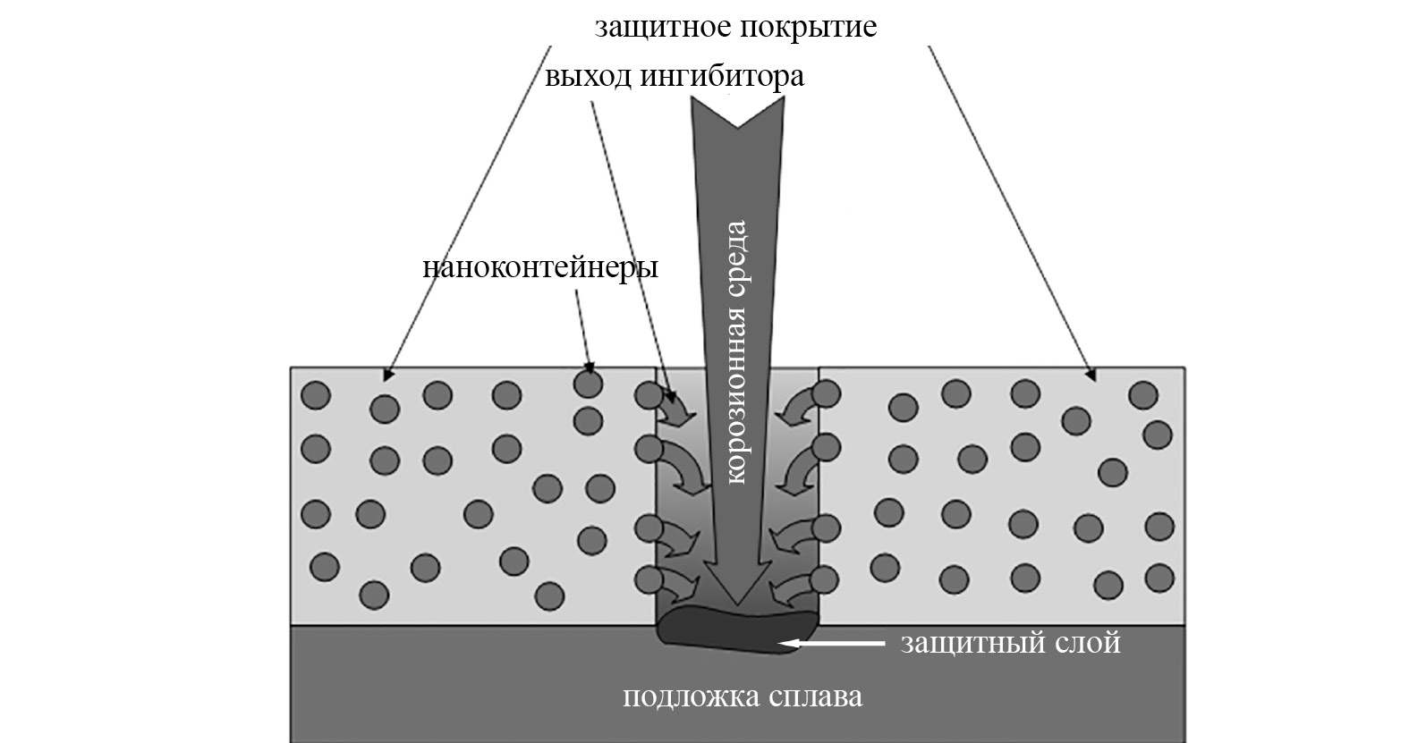 Подход, лежащий в основе создания самозалечивающихся покрытий, заключается в том, что такие защитные слои должны не только служить барьером от внешнего воздействия, но и реагировать на изменения в собственной внутренней структуре, сочетая механизмы защиты от повреждений и восстановления целостности покрытия. В настоящее время изучены принципы действия многих ингибиторов, и каждый имеет определенные недостатки. Некоторые из них можно минимизировать путем внедрения ингибитора коррозии в структуру, играющую роль контейнера, т.е. путем капсулирования ингибитора. По этой причине разрабатываются самовосстанавливающиеся покрытия, содержащие в своем составе наноконтейнеры, наполненные ингибитором коррозии (рис. 2) [42]. В процессе механического и/или коррозионного повреждения покрытия происходит активация сформированного наноконтейнера под воздействием изменения состава внешней среды и высвобождение ингибитора, который взаимодействует с незащищенным участком поверхности с образованием защитного слоя, тем самым продлевается срок службы материала (рис. 3). Однако использование наноконтейнеров зачастую ограничивается их низкой совместимостью с матрицей покрытия.
