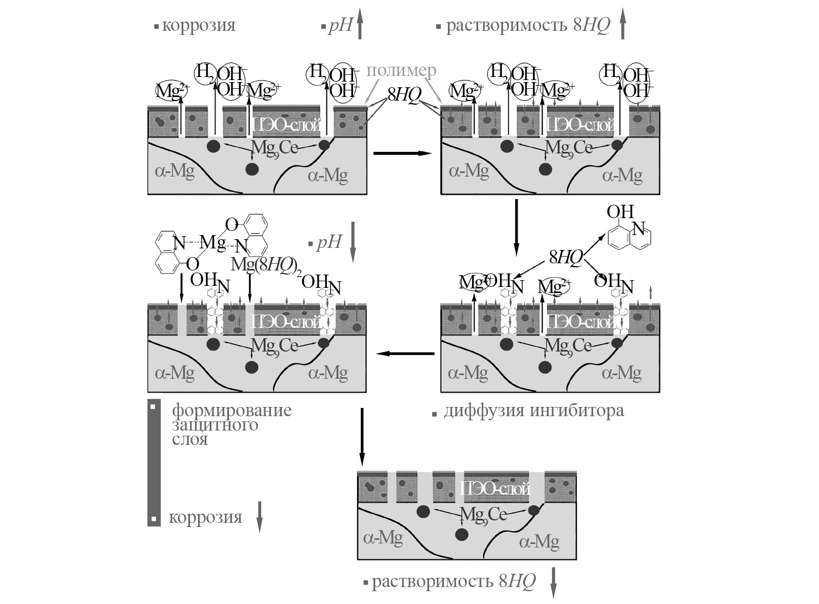 Было обнаружено положительное влияние 8HQ на коррозионную активность сплава AZ31 путем создания гибридного золь-гель-покрытия с внедрением в его состав ингибитора коррозии [34]. Высокая эффективность ингибитора была зафиксирована для гибридных ПЭО-покрытий, импрегнированных 8HQ [12]. Данный эффект обусловливается формированием малорастворимого устойчивого комплексного соединения Mg(8HQ)2, блокирующего протекание коррозионного процесса в областях микродефектов и микропор в ПЭО-слое (рис. 5).