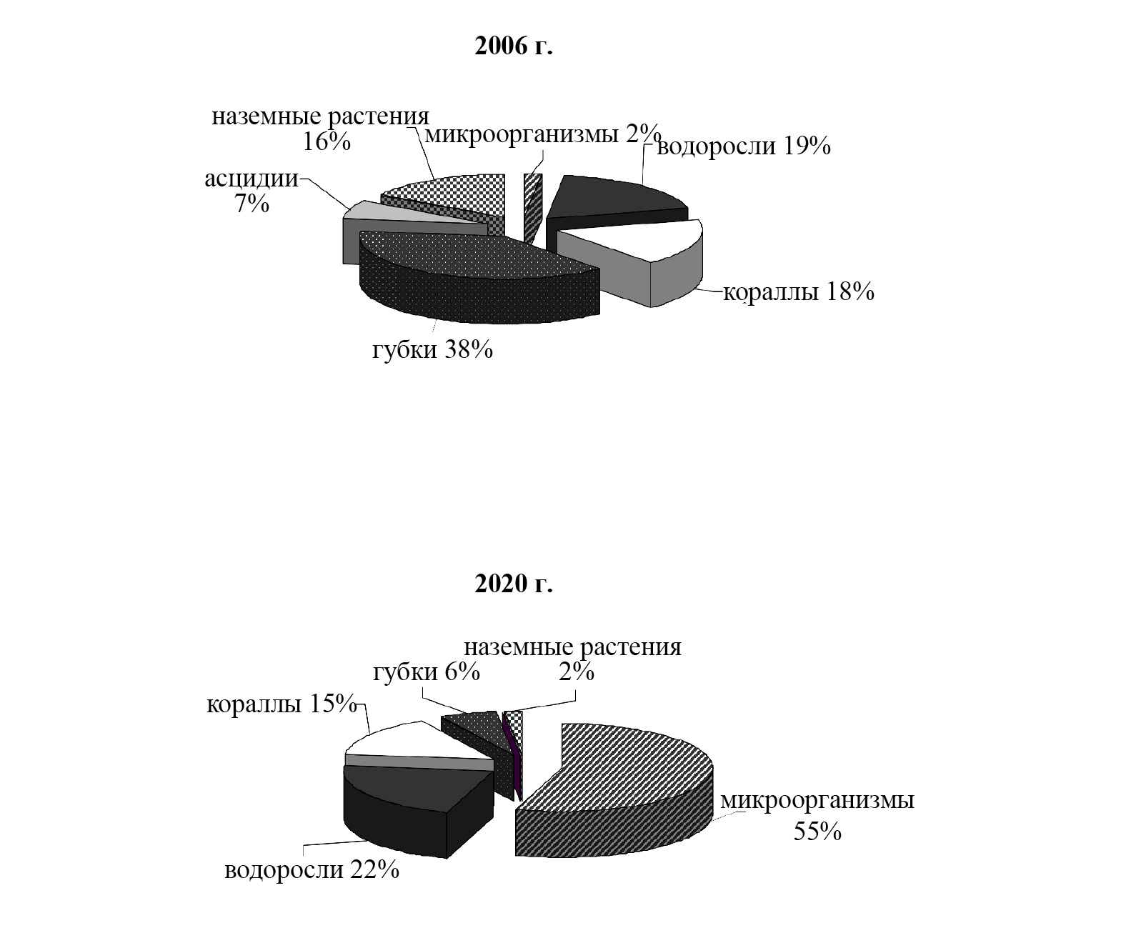 Источником природных противообрастающих веществ являются различные обитатели морей и океанов – микроорганизмы, водоросли, беспозвоночные, а также наземные растения. На рисунке представлены диаграммы распределения по классам организмов, из которых были выделены природные соединения с антиобрастающими свойствами. Как показывают представленные данные, в начале 2000-х годов подавляющее количество активных соединений было выделено из морских организмов – губок, водорослей и кораллов. Через 14 лет основным источником соединений с антиобрастающими свойствами становятся микроорганизмы (бактерии и грибы). Существенное увеличение доли активных соединений, выделенных из микроорганизмов, связано прежде всего с детальным исследованием биосинтетических способов получения и механизмов действия антиобрастающих соединений, что привело к выявлению защитных соединений, которые продуцируются микроорганизмами, ассоциированными с макроорганизмом-хозяином.