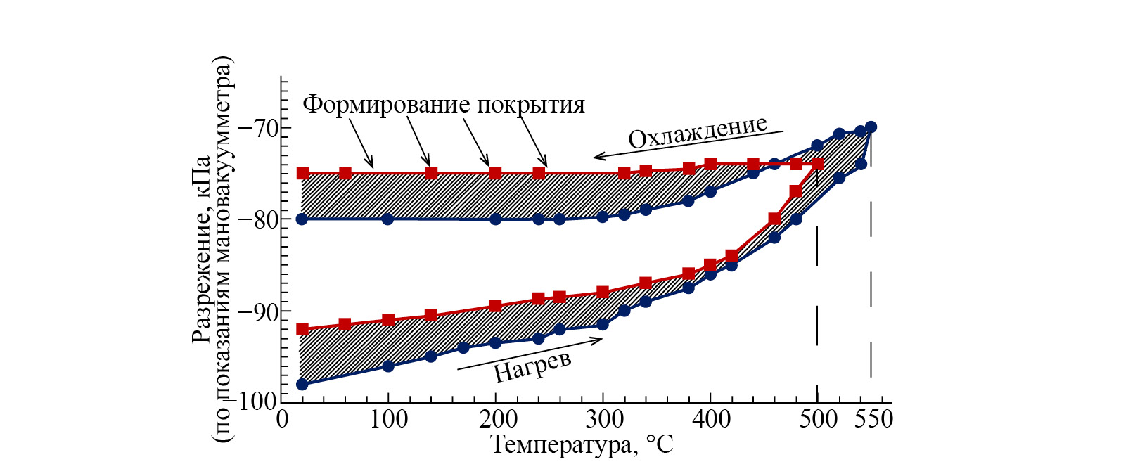 Принципиальное отличие технологической схемы (рис. 1, г) заключалось в том, что нанесение модифицирующего покрытия осуществлялось в условиях разрежения до 98 кПа. Оптимальные режимы обработки для получения качественного покрытия были установлены экспериментально. Область изменения режимных параметров, температуры и разрежения в рабочей камере в зависимости от вида исходного сырья, типа модифицирующего вещества, степени загрузки установки представлены на рис. 2 (заштрихованный участок).
