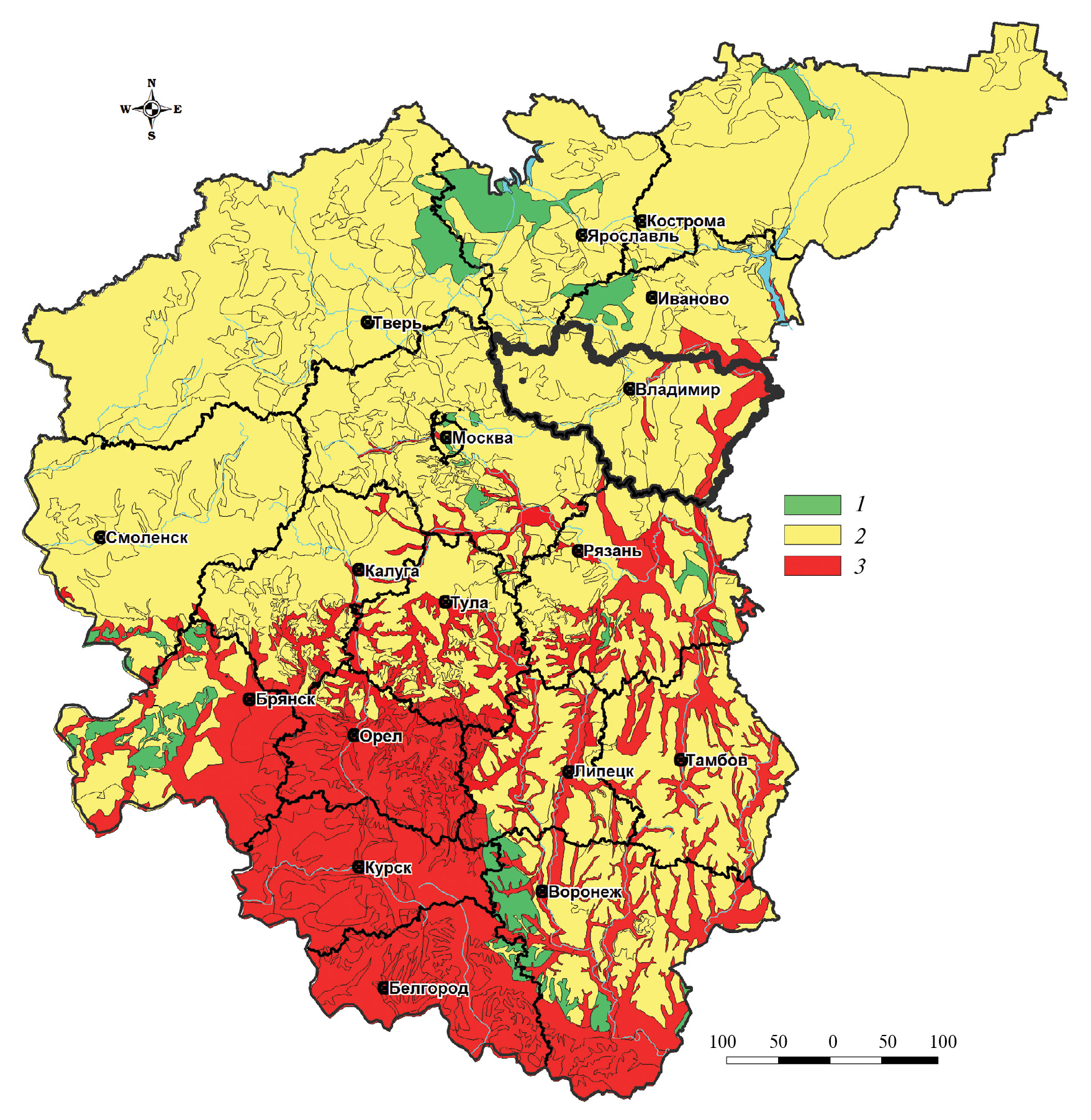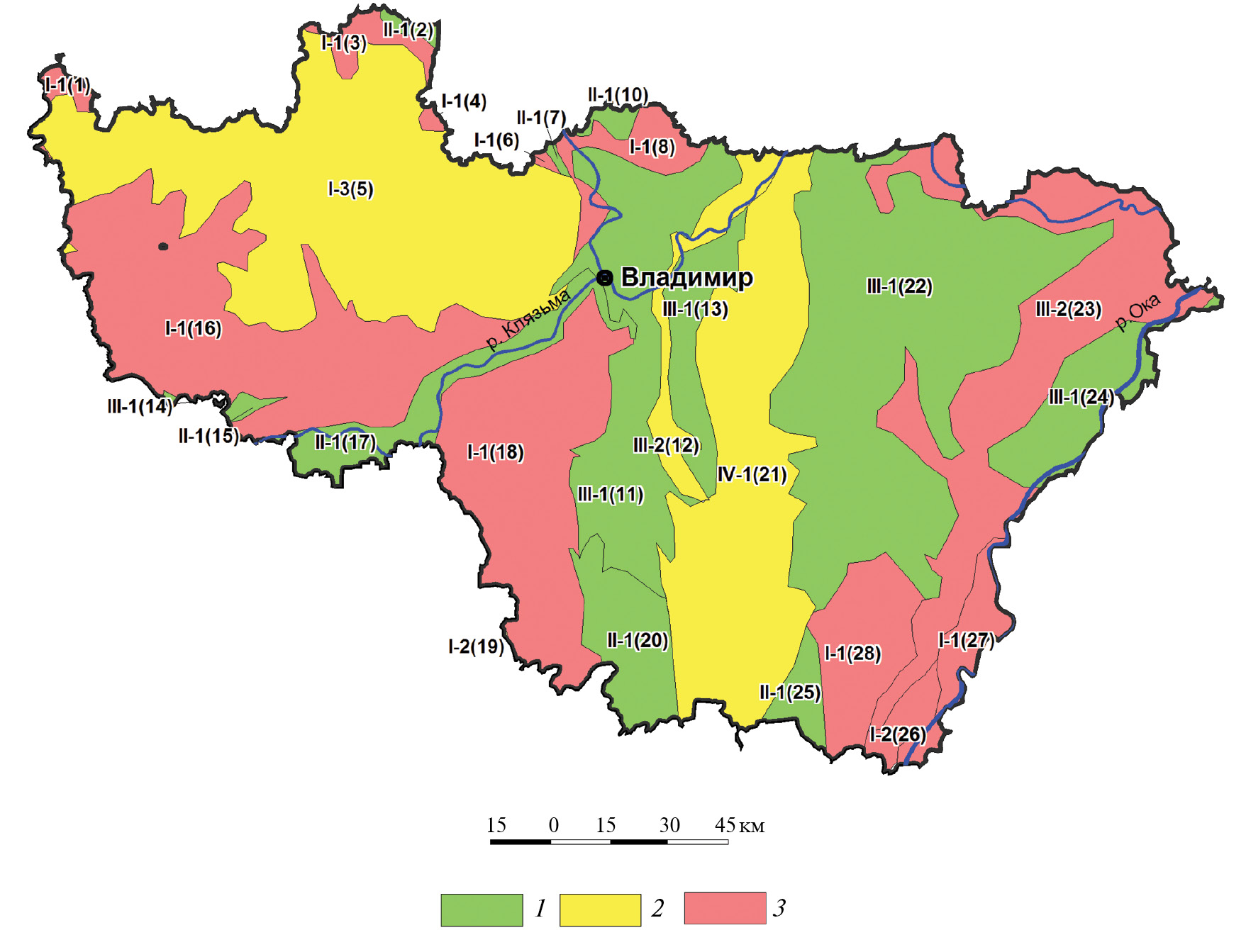 Рис. 1. Положение Владимирской обл. на генерализованной карте мелкомасштабного районирования ЦФО для целей размещения полигонов ТБО. Условные обозначения: 1 — благоприятные, 2 — условно благоприятные, 3 — неблагоприятные.