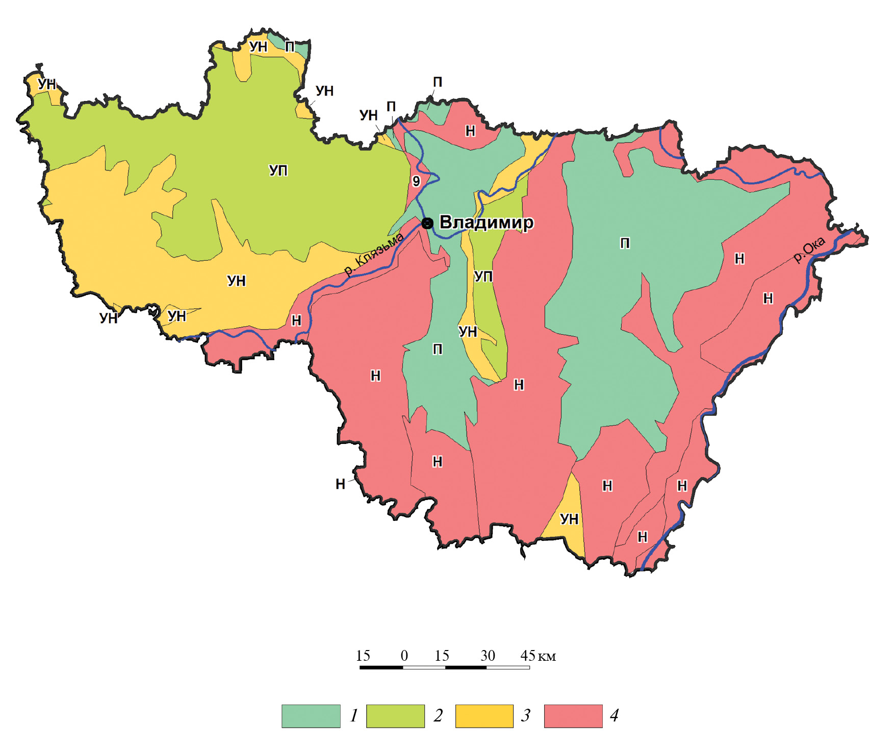 Рис. 3. Карта-схема пригодности природных условий Владимирской обл. для размещения объектов ТКО. 1 — пригодные; 2 — условно пригодные; 3 — условно непригодные; 4 — непригодные. Буквенные индексы на карте соответствуют обозначениям комплексного индекса пригодности территорий в табл. 4.
