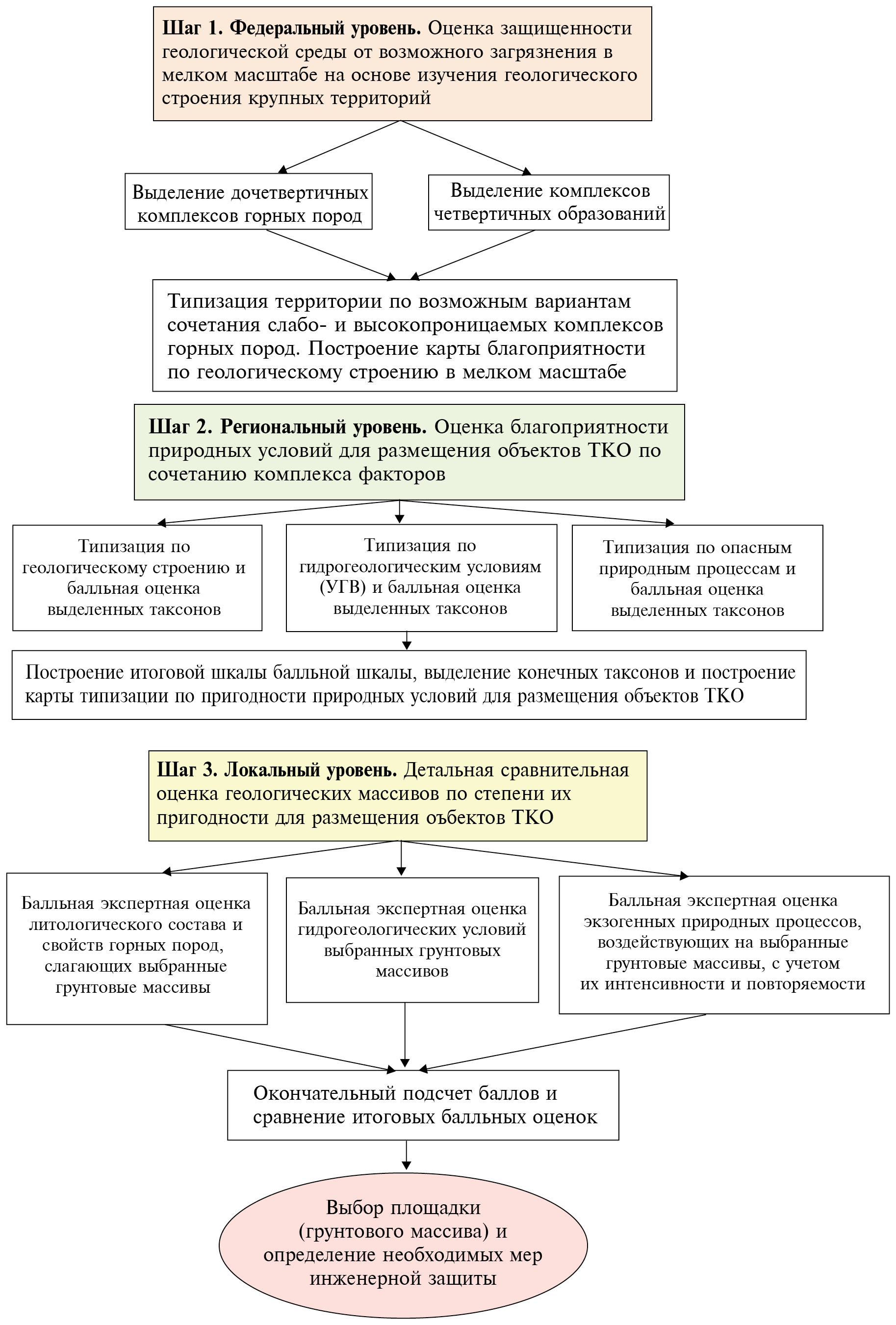 Рис. 4. Блок-схема поэтапной оценки пригодности геологической среды для размещения объектов ТКО.