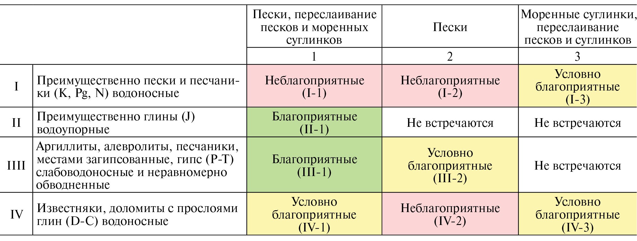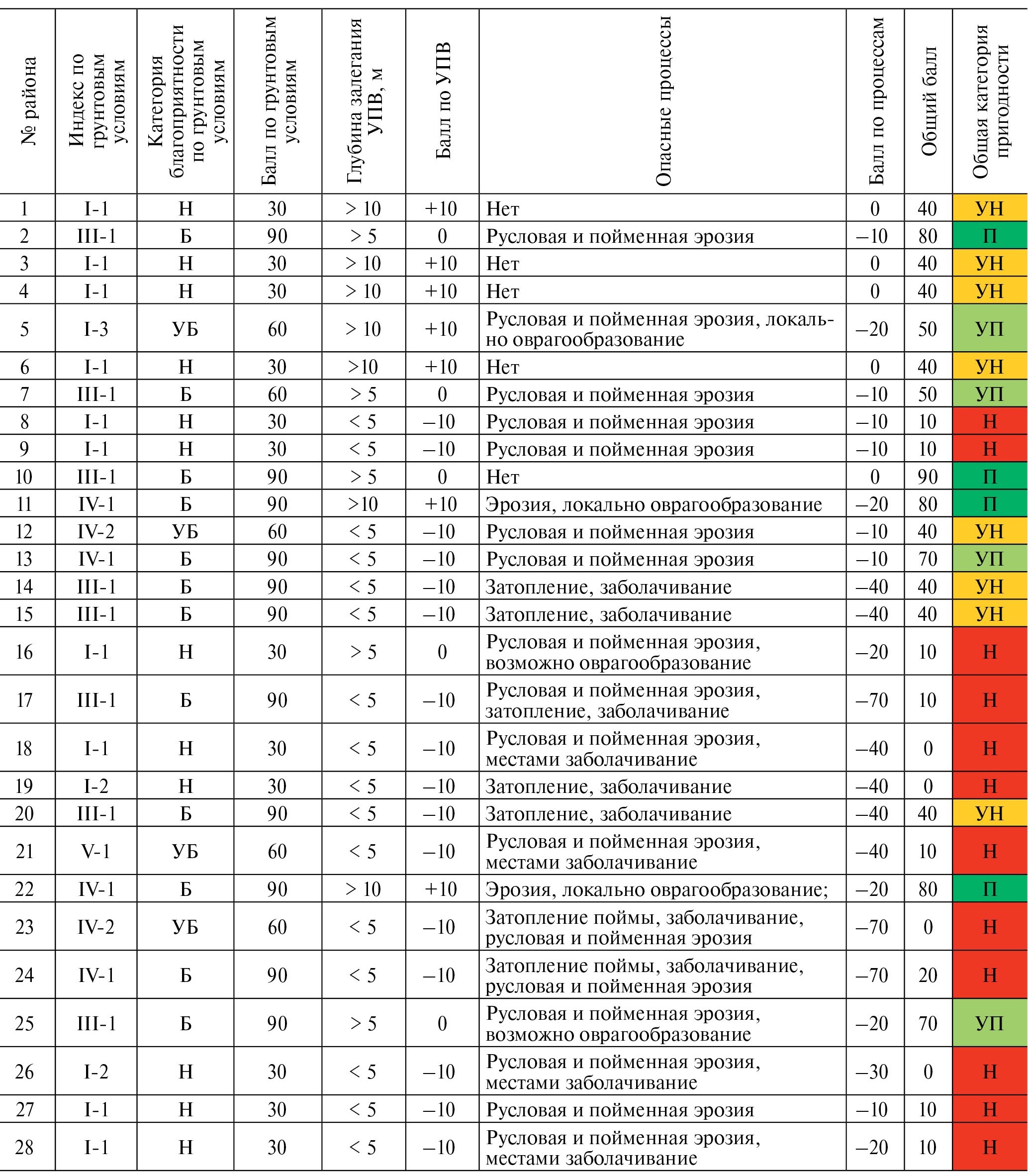Примечание. Индексы благоприятности территории по грунтовым условиям: Б — благоприятные; УБ — условно благоприятные; Н — неблагоприятные; комплексный индекс пригодности территории: П — пригодные; УП — условно пригодные; УН — условно непригодные; Н — непригодные