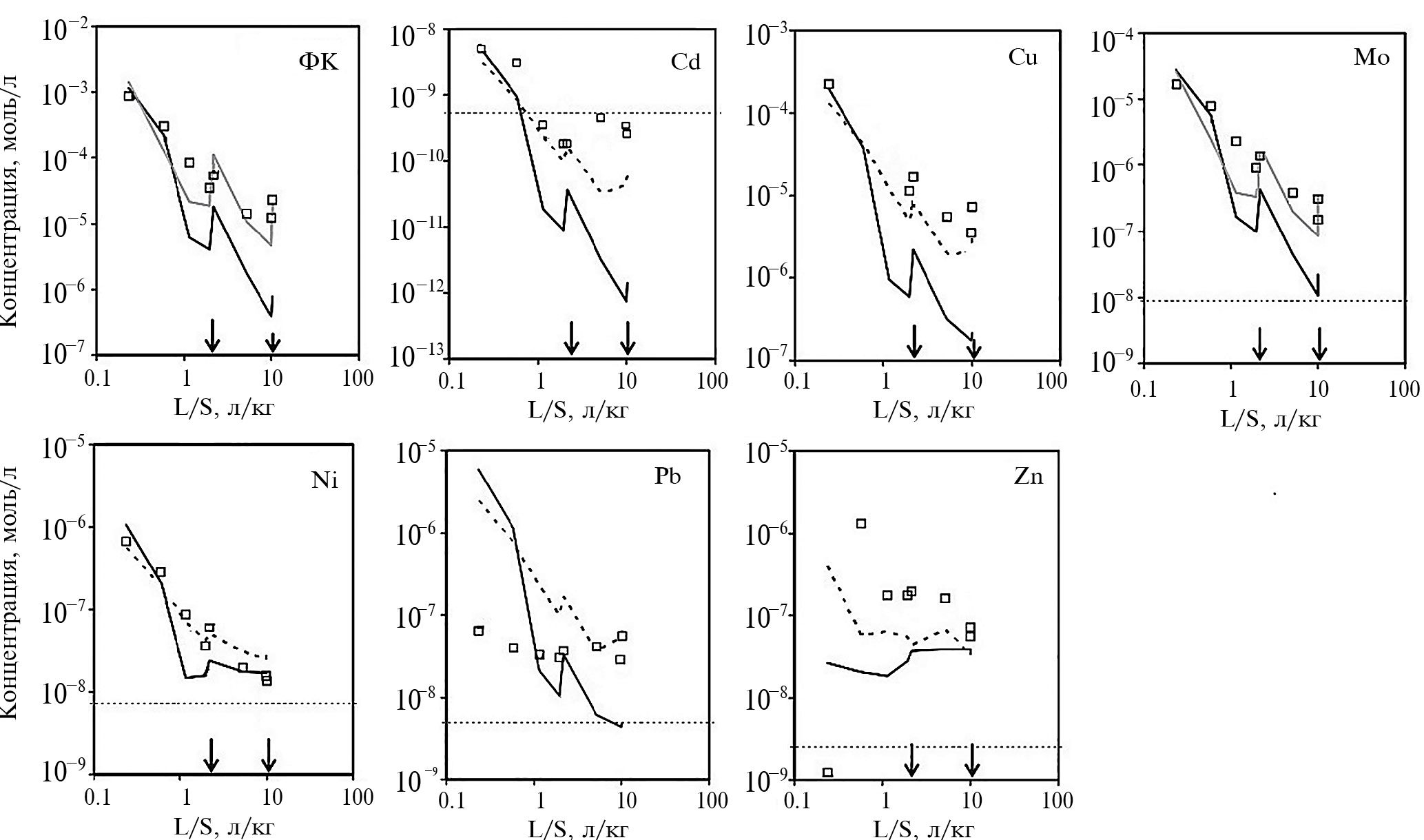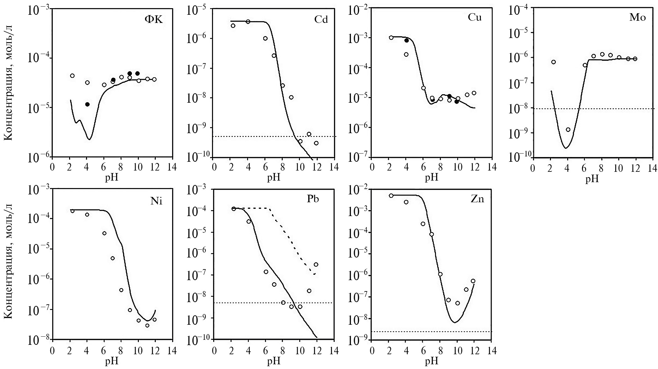 Измеренные в [11] концентрации и модельные прогнозы ряда важных компонентов (ФК, Cd, Cu, Mo, Ni, Pb и Zn) показаны на графиках относительно pH на рис. 2.