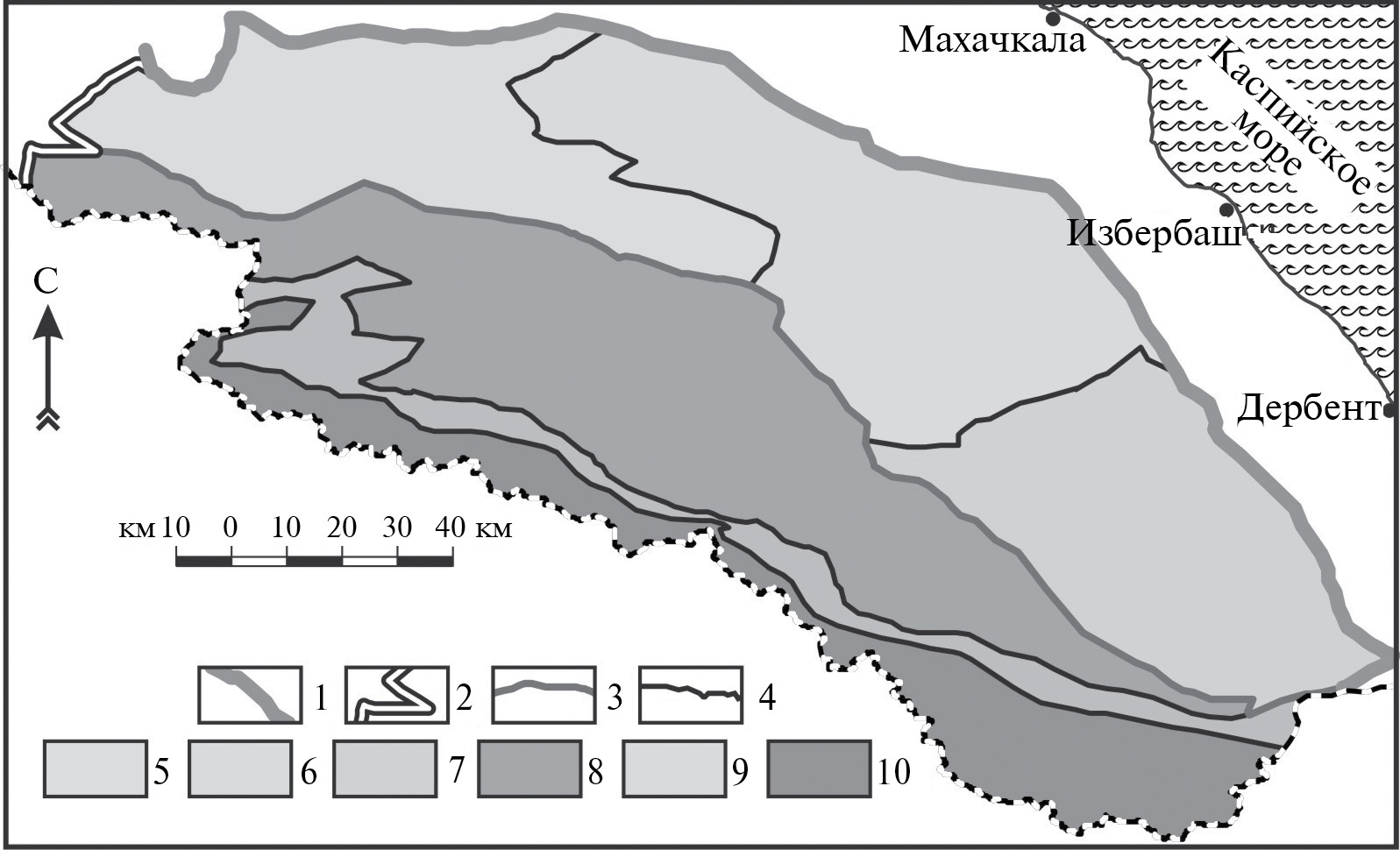 Рис. 1. Схема неоструктурного районирования Российской части Восточного сегмента Мегасвода Большого Кавказа. 1–4 – границы: 1 – Мегасвода Большого Кавказа, 2 – сегментов мегасвода, 3 – зон, 4 – подзон Восточного сегмента; 5–10 – структурные элементы мегасвода: 5–7 – подзоны Северо-восточной зоны: 5 – Западная, 6 – Восточная; 7 – Южная; 8–10 – подзоны зоны Центральных поднятий: 8 – Бокового хребта, 9 – Осевых прогибов, 10 – Главного хребта.