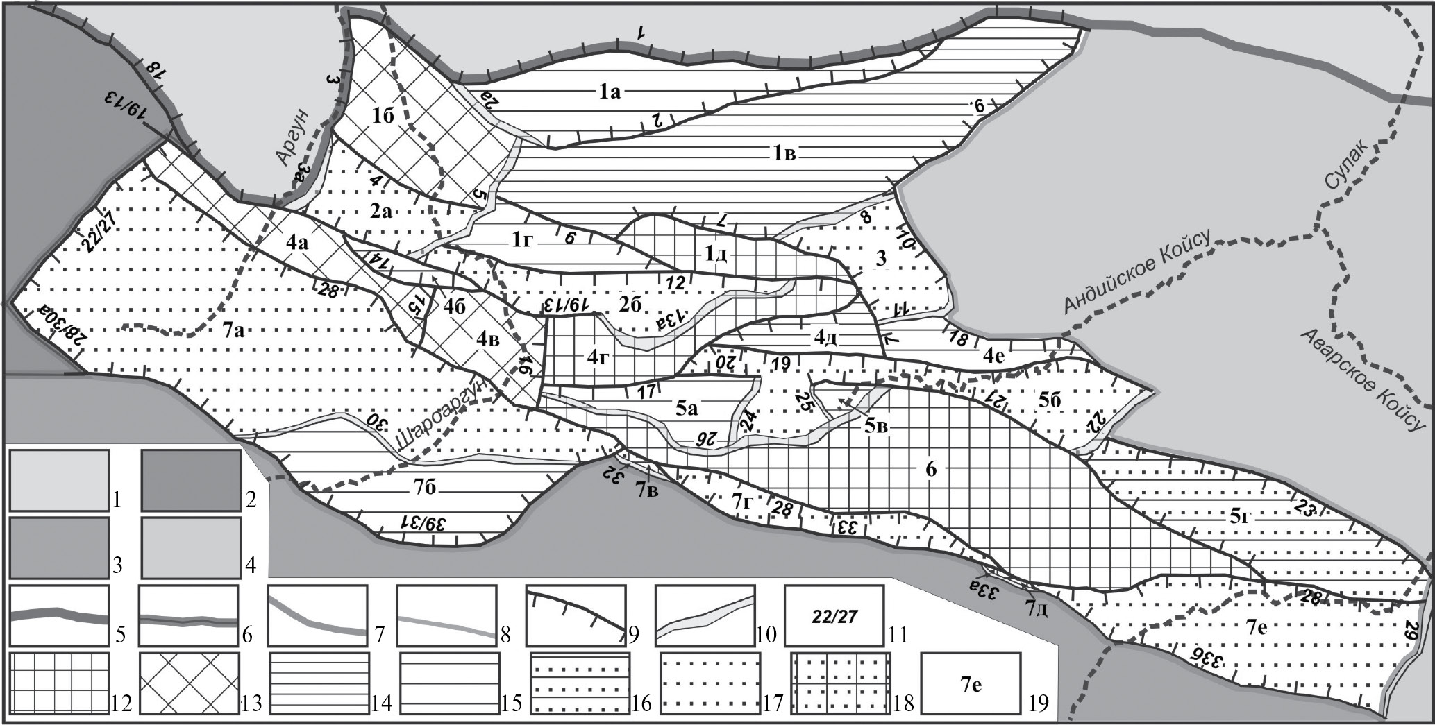 Западная подзона включает преимущественно субширотные структуры (см. табл. 1, рис. 2): Нуйкорт-Керкетское северное краевое поднятие (1), Беной-Дайскую цепь грабенов (2), Андийский поперечный грабен (3), Дайхохско-Килятлинскую гряду поднятий (4), Амуши-Хунзахскую систему прогибов (5), Аржутинский горст (6), Южную краевую цепь грабенов (7).