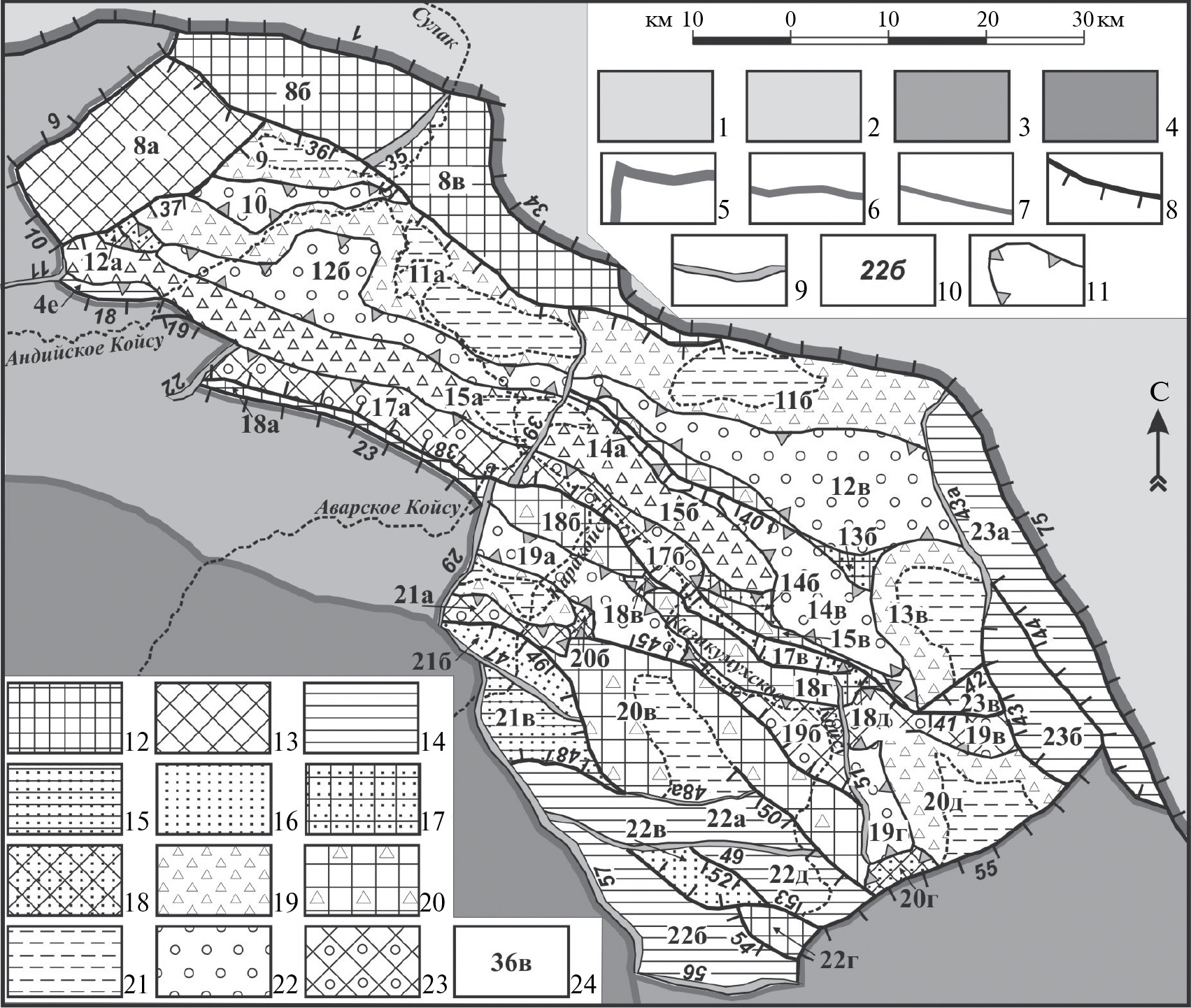 Рис. 3. Схема неоструктурного районирования Восточной подзоны Северо-восточной зоны Восточного сегмента. 1 – Терско-Каспийский краевой прогиб; 2–3 – подзоны Северо-восточной зоны: 2 – Западная, 3 – Южная; 4 – Зона центральных поднятий; 5–7 – границы: 5 – Мегасвода Большого Кавказа, 6 – зон, 7 – подзон; 8 – сбросы; 9 – флексуры; 10 – номера разрывов и флексур (см. табл. 2); 11 – пликативные сочленения; 12–23 – типы блоковых и складчатых структур Восточной подзоны: 12 – горсты, 13 – горст-ступени, 14 – ступени, 15 – грабен-ступени, 16 – грабены, 17 – перемычки, 18 – седловины, 19 – антиклинали, 20 – горст-антиклинали, 21 – днища размытых сводов антиклиналей, 22 – синклинали, 23 – грабен-синклинали; 24 – номера блоковых структур (см. табл. 1).