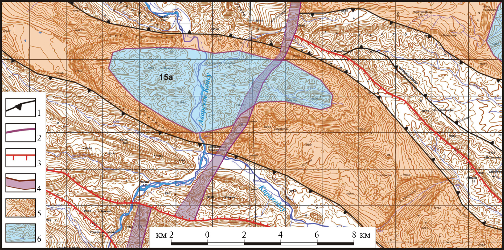 Рис. 4. Аракмеэрская антиклиналь с размытым сводом (15а). 1 – границы пликативных структур; 2 – границы днища размытого свода; 3 – сбросы; 4 – флексуры; 5 – антиклинали; 6 – днища размытых сводов.