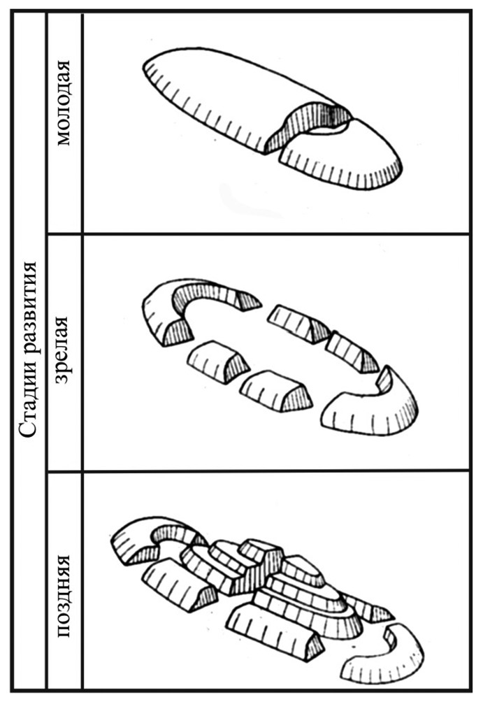 Следует отметить, что подобные преобразования характерны для складок, в строении которых относительно пластичные отложения перекрываются более прочными, например, во впадинах Средней Азии, где на песчано-глинистые породы налегают сцементированные конгломераты. Там антиклинальные увалы первой стадии после разрушения свода сменяются кольцевой грядой (рис. 5) [5]. Во всех случаях разрушение сводов происходит за счет расширения и частого слияния речных долин, пересекающих эти антиклинали. Такому расширению способствует снижение прочности сводов за счет повышения их трещиноватости. Соответственно, следует выделять две стадии орографического преобразования антиклинальных складок, когда антиклиналь-увал сменяется антиклиналью с размытым сводом.