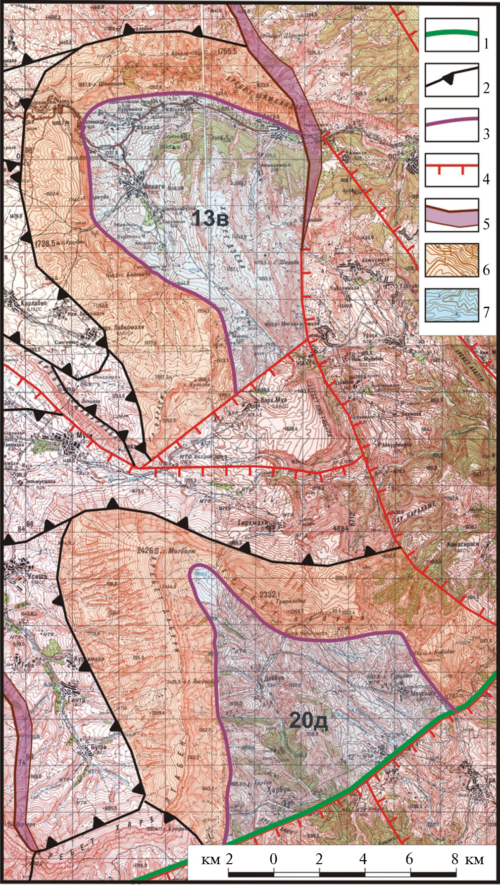 Рис. 6. Северомугринская (13в) и Дейбукская (20д) “полуантиклинали” с размытыми сводами. 1 – граница Восточной и Южной подзон Северо-восточной зоны; 2 – границы пликативных структур; 3 – границы днищ размытых сводов антиклиналей; 4 – сбросы; 5 – флексуры; 6 – антиклинали; 7 – днища размытых сводов.