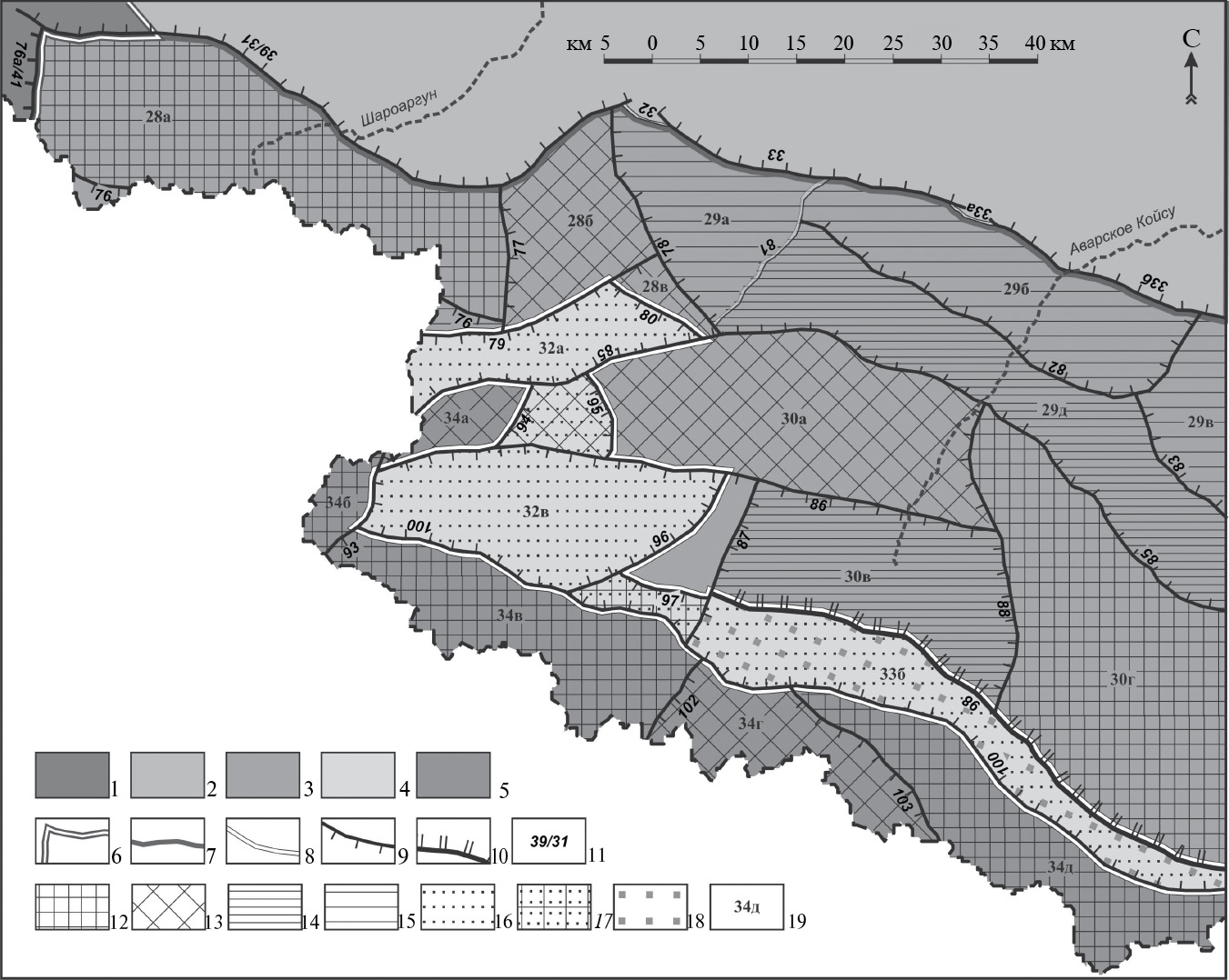 Центральное поднятие Бокового хребта (30) имеет на западе “зубчатую” разрывную границу с грабенами запада Подзоны осевых прогибов. К этой границе подходит крупная Кадская (30а) и маленькая узкая Богосская (30б) грабен-ступени. К югу от первой из них, гранича по Гирискому сбросу (86) располагается Анцухская высокая ступень (30в), имеющая прямоугольную форму. Эта высокая ступень и Кадская горст-ступень (30а) отделяются с востока по Нукулорскому поперечному сбросу (88) от обширного, в целом прямоугольного Гечбичского горста (30г). Этот горст и Анцухская высокая ступень (30в) граничат на юге по Тляратинскому взбросу (98) с Бежтинским грабеном (33б) из подзоны Осевых прогибов. Гечбичский горст (30г) по Верхнесамурскому поперечному сбросу (89) отделяется от Юго-восточной группы горстов (31). К этому сбросу примыкает на севере небольшая и узкая Лаказаниская седловина (31б), а южнее – западный торец протяженного Хултайдагского горста (31г). К упомянутой седловине с востока по Балиалскому сбросу (90) примыкает протяженный, широкий в центре и сильно суживающийся на востоке Самурский горст (31а). Он по Катрухскому сбросу (91) граничит с узким (щелевидным) Карасамурским грабеном (31в), который с юга отделяется Ихрекским сбросом (92) от Хултайдагского горста (31д). Вся Юго-восточная группа горстов сопрягается с протяженным Самурским грабеном (33в) по Южнобежтинскому сбросу (100).