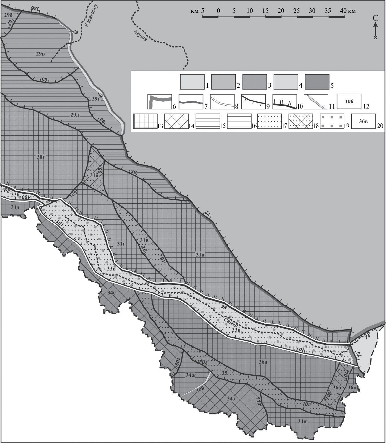 Далее к востоку почти на 150 км протягивается Бежтино-Самурская шовно-депрессионная зона (33), ориентированная в целом с северо-запада на юго-восток. Она делится поперечным сбросом на два крупных самостоятельных грабена. С северо-востока зона ограничена взбросом, а с юго-запада – сбросами. По характеру ограничивающих данную зону разрывных структур она ближе к Садонской шовно-депрессионной зоне.