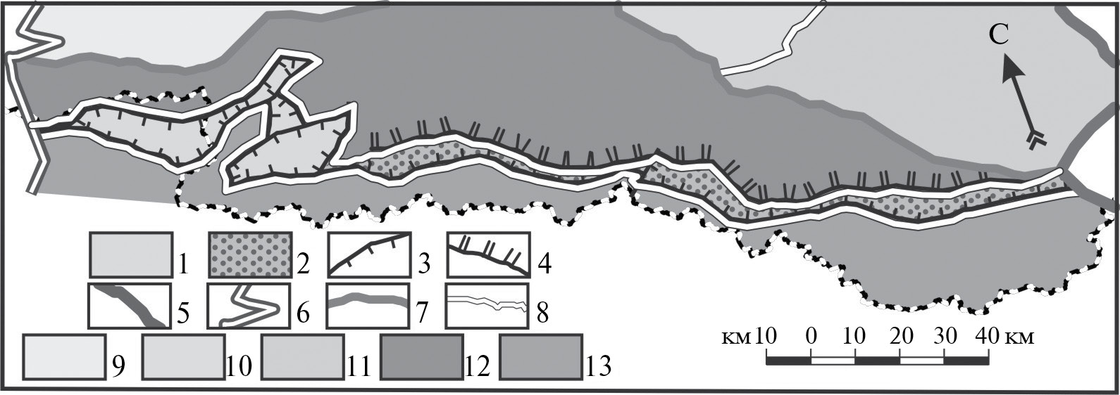Рис. 10. Строение подзоны Осевых прогибов. 1–2 – грабены подзоны Осевых прогибов: 1 – Северо-западная группа грабенов, 2 – Бежтино-Самурская шовно-депрессионная зона; 3–4 – разрывы: 3 – сбросы, 4 – взбросы; 5–8 – границы: 5 – мегасвода Большого Кавказа, 6 – сегметов мегасвода, 7 – зон, 8 – подзон; 9–11 – подзоны Северо-восточной зоны: 9 – Западная, 10 – Восточная; 11 – Южная; 12–13 – подзоны зоны Центральных поднятий: 12 – Бокового хребта, 13 – Главного хребта.