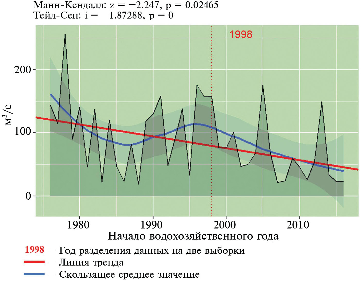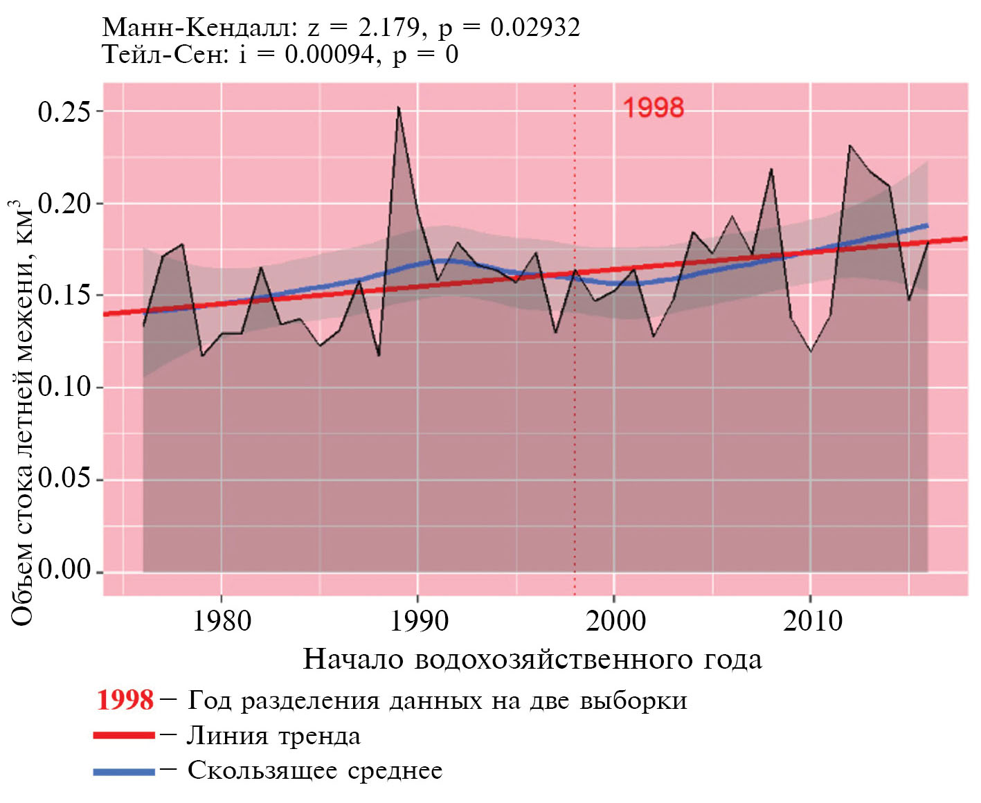 Для Свияги четко прослеживаются значимые положительные тренды увеличения стока летне-осенней и зимней меженей. Рост летнего меженного стока (рис. 2) связан, прежде всего, с увеличением запасов подземных вод в ее начале, вследствие уменьшения глубины промерзания и площади его распространения, а также за счет увеличения частоты дождевых паводков.