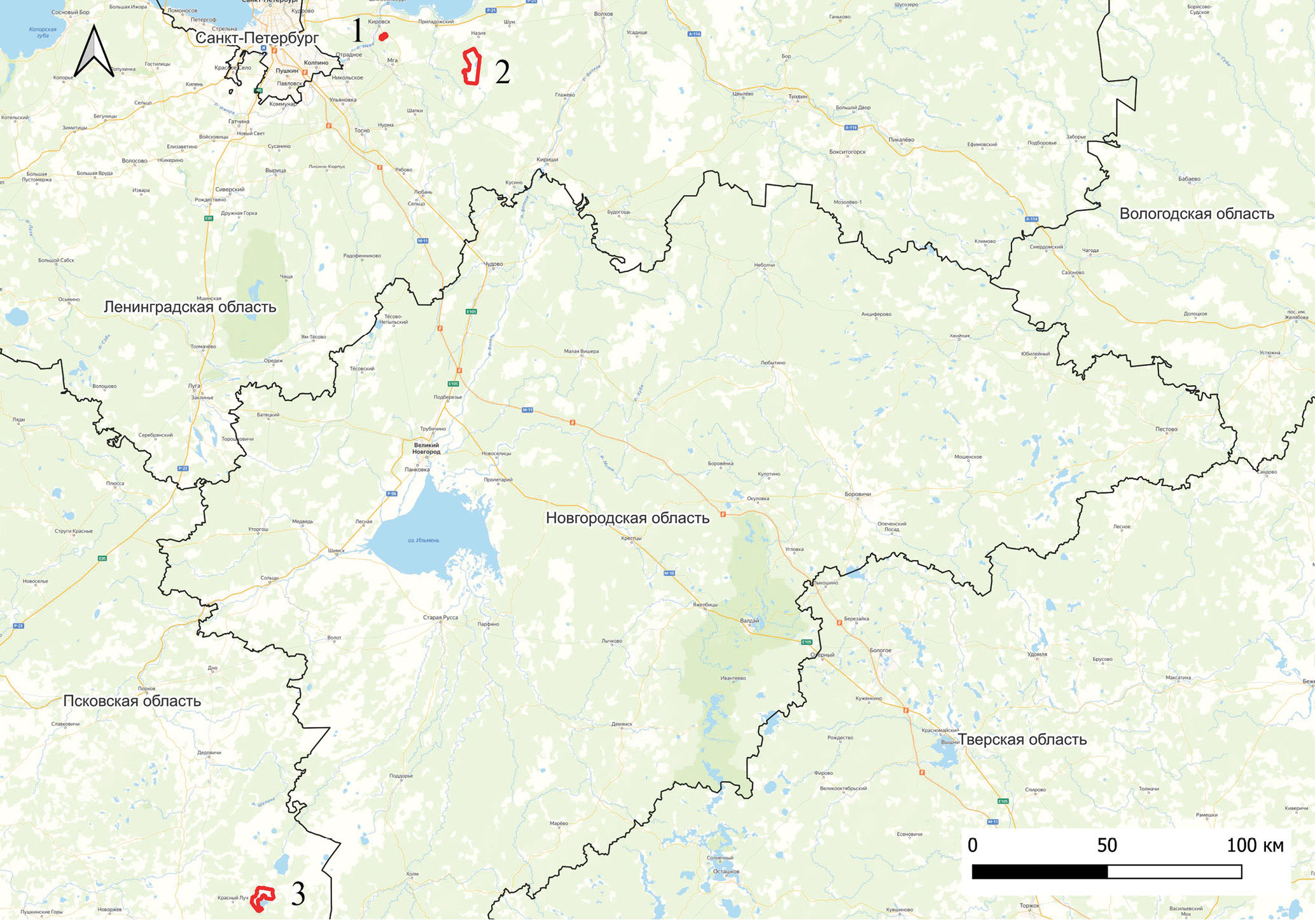 Рис. 1. Расположение эталонных участков: 1 – Малодубровское, 2 – Гладкий Мох, 3 – Заячий Отрог.