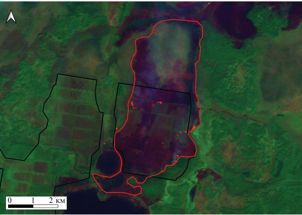 С помощью анализа данных NASA FIRMS, которые фиксируют даты возникновения пожаров, можно выявить все возгорания за выбранный период времени на исследуемых торфяниках. Каждый очаг пожара дешифрируется по оптическому снимку на тот момент, когда он перестает увеличиваться. Продолжительность каждого пожара определяется разницей дат “термоточек”, его фиксирующих, или по разнице дат ближайших оптических снимков (до и после пожара) (рис. 3).