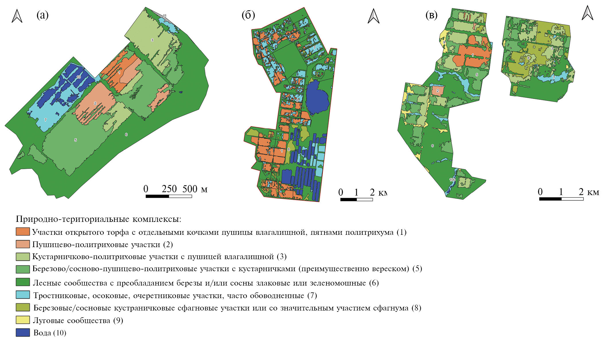 В результате получены карты групп ассоциаций растительности на каждый участок (рис. 4), на которых основной картографируемой единицей являются растительные сообщества ранга группа ассоциаций. Всего было выделено 9 групп ассоциаций (табл. 2). Осоково/тростниково-политриховая группа ассоциаций растительности (под номером 4) не выделялась на картах при данном масштабе, так как занимает незначительные площади, но была встречена при описании растительного покрова осушенных торфяников.