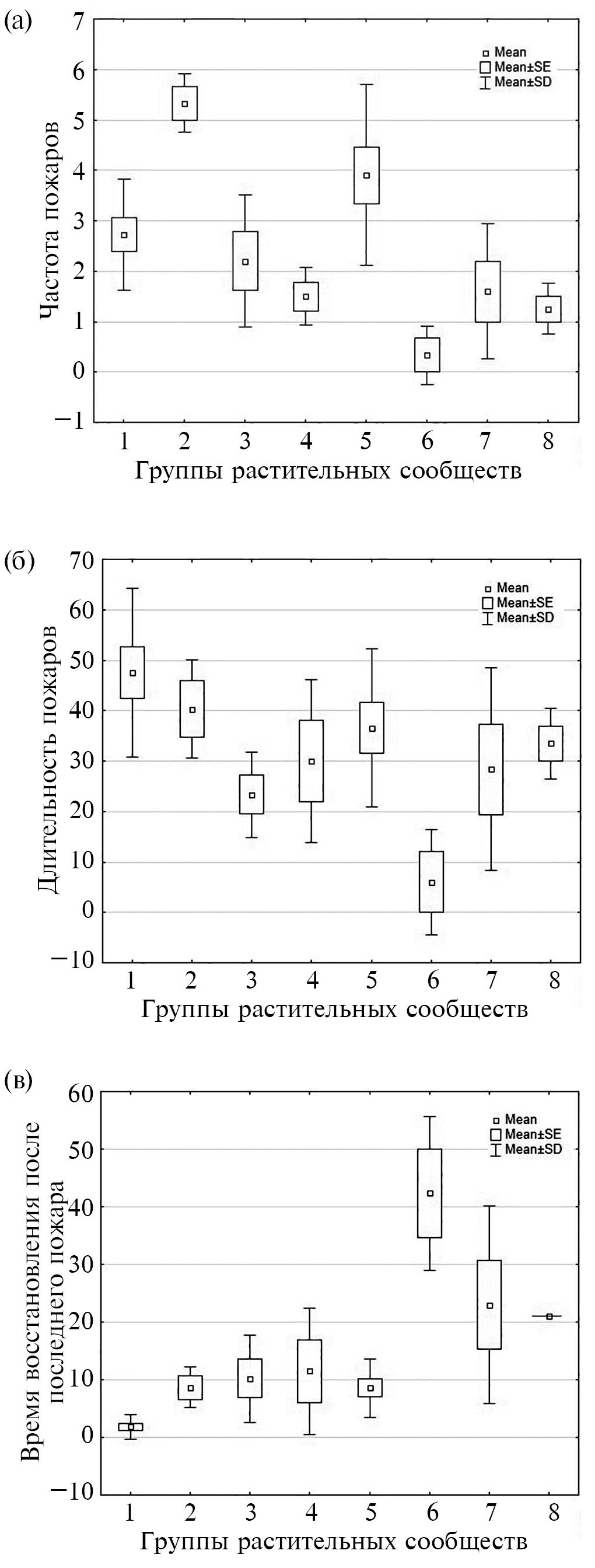 № | Группы ассоциаций растительности | Средняя частота пожаров | Средняя длительность пожаров (дни) | Среднее время, прошедшее после последнего пожара (год) |