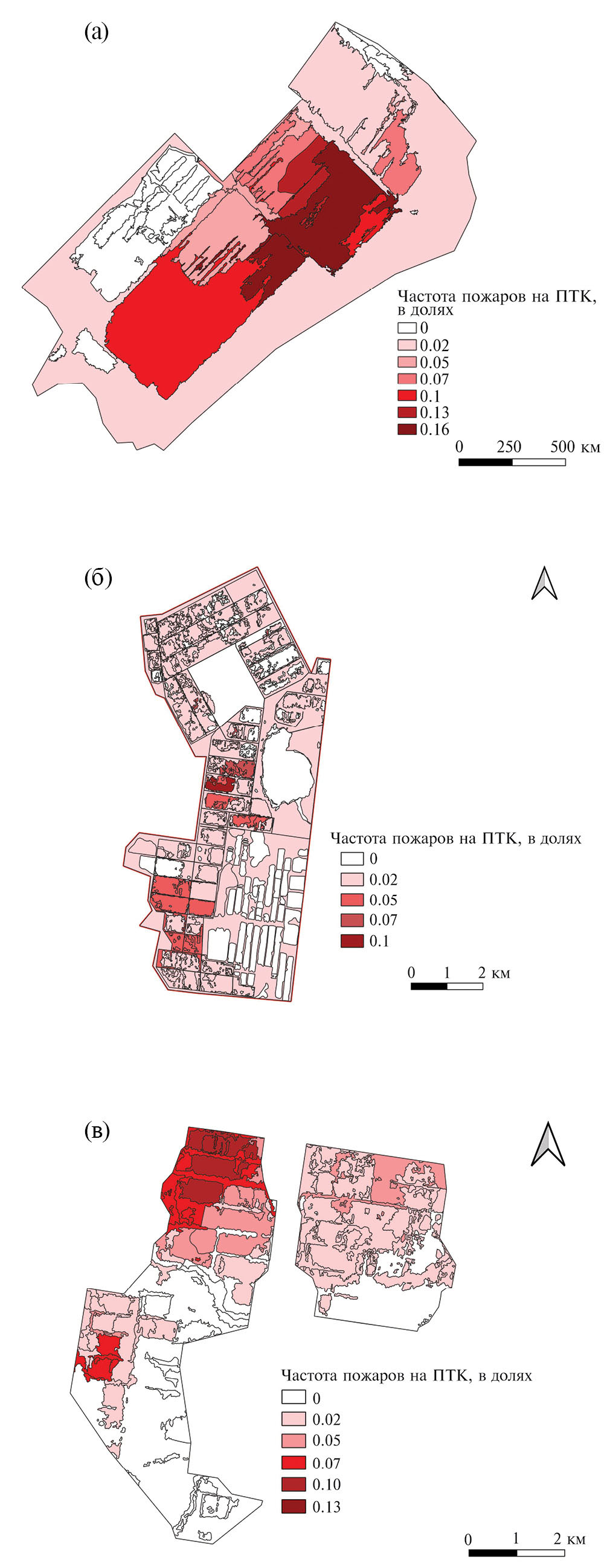 Рис. 6. Карты частоты пожаров (в долях) за весь период наблюдений: а – Малодубровское, б – Гладкий Мох, в – Заячий Отрог.