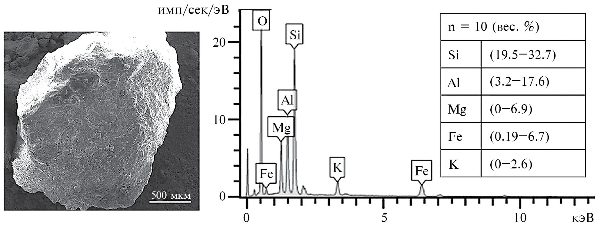 Описание эксперимента. В качестве образцов использовали обломочный материал (ОМ) тела Бурейского оползня, который просеяли через гранулометрическое сито для получения фракции размером 3 мм. По данным электронного зондирования 10 отдельных зерен из отобранной фракции ОМ установлено, что содержание элементов варьирует в следующих пределах (вес. %): Si (19.5–32.7); Al (3.2–17.6); Mg (0–6.9); Fe (0.19–6.7); K (0–2.6). Образцы, использованные в эксперименте, согласно доминирующему элементу можно условно отнести к кремнийсодержащим минералам (рис. 1).