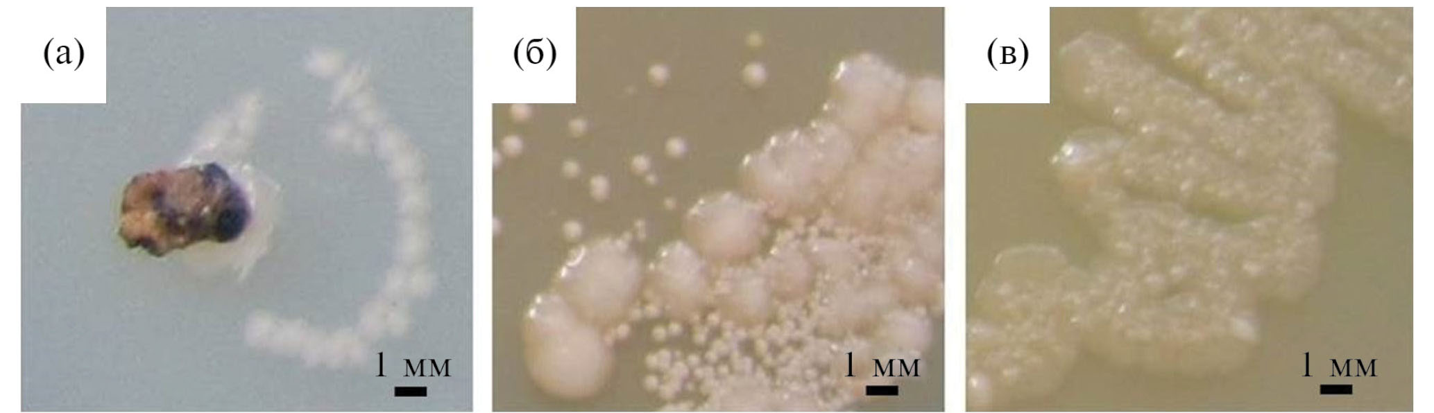 Рис. 2. Доказательство жизнеспособности микроорганизмов после 30 сут замораживания при –18°С образцов ОМ: а – сухой образец; б – образец в Н2О/Д; в – образец в присутствии пептона.