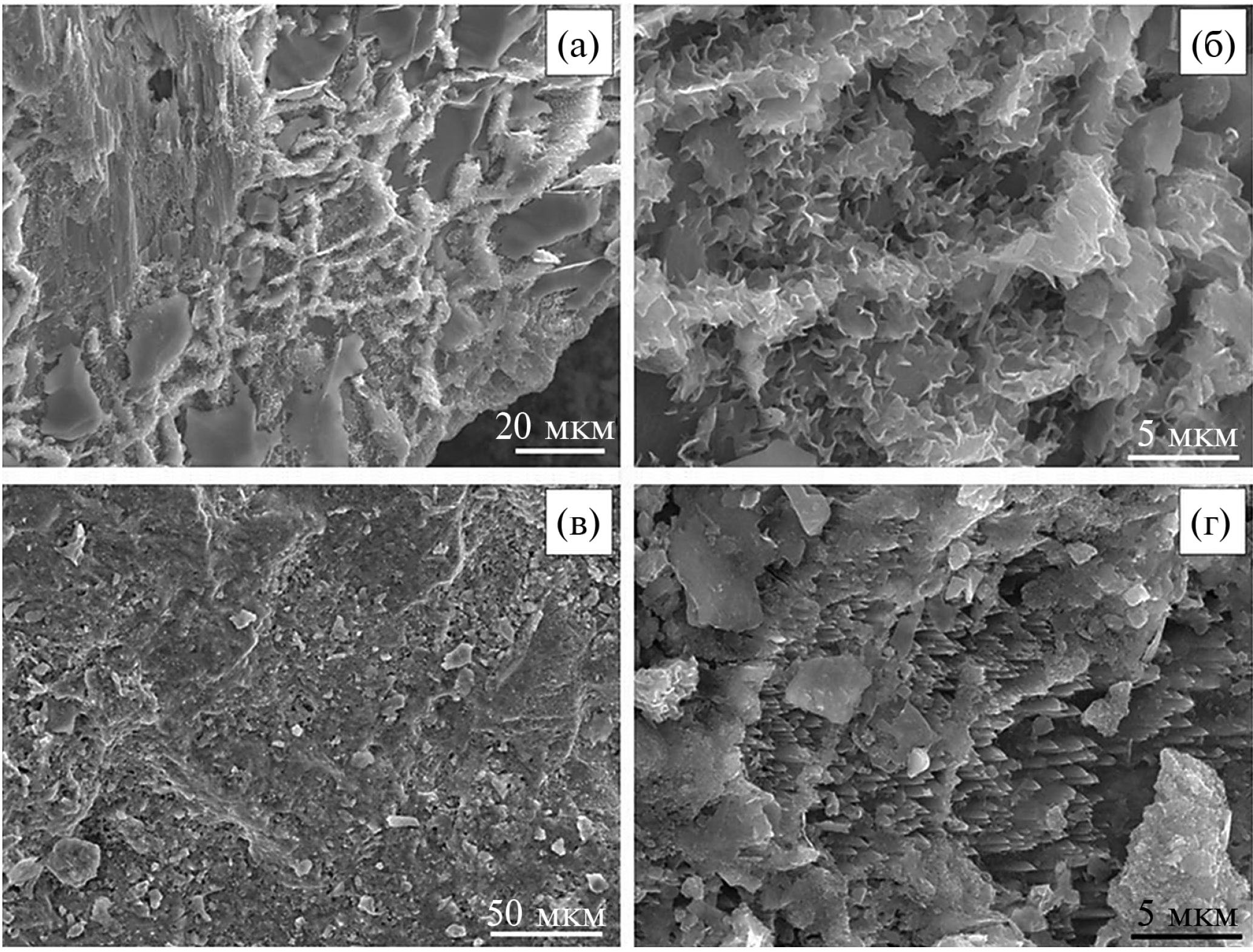 Хорошо выраженные на СЭМ-изображениях ячеистые микроструктуры (см. рис. 3б) чаще всего характерны для смектита, хотя формирование иллита тоже связывают с образованием волокнистой текстуры. Например, на периферии пластинчатых частиц аутигенного иллита иногда формируются решетчатые или волокнистых микроструктуры, похожие на смектит. Однако после обработки монтмориллонита пресной водой происходила морфологическая трансформация агрегатов неправильной ячеистой формы в аморфный гель [44].