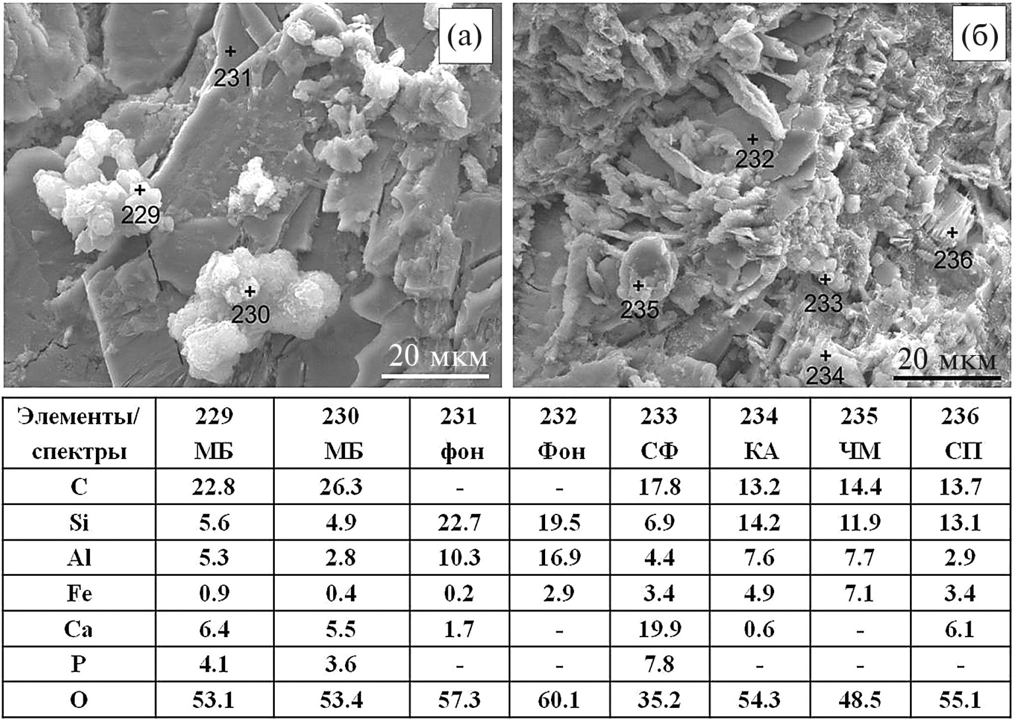 Рис. 4. СЭМ-изображение и элементный состав отдельных локусов поверхности частицы ОМ в водном растворе с пептоном после циклического замерзания (–18°С) и оттаивании при температуре: а – 4°С (спектры 229–231); б – 23°С (спектры 232–236). МБ – микроколонии бактерий, СФ – сфероиды; КА – коллоидные агломераты; ЧМ – чешуйчатая микроструктура; СП – стопка из пластинок.