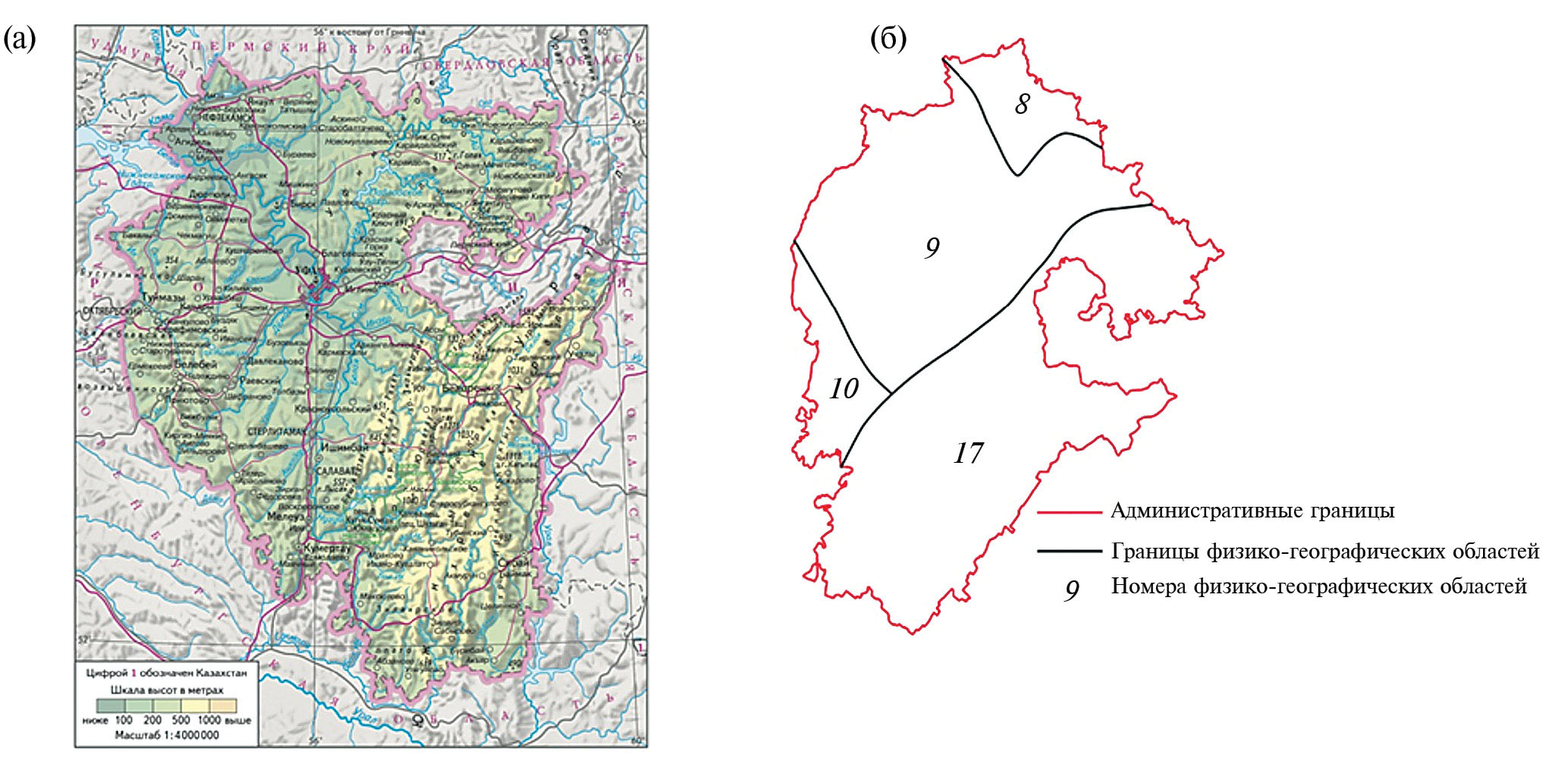 Рис. 1. Физическая карта (а) и границы физико-географических областей (б) Республики Башкортостан (см. табл. 1).