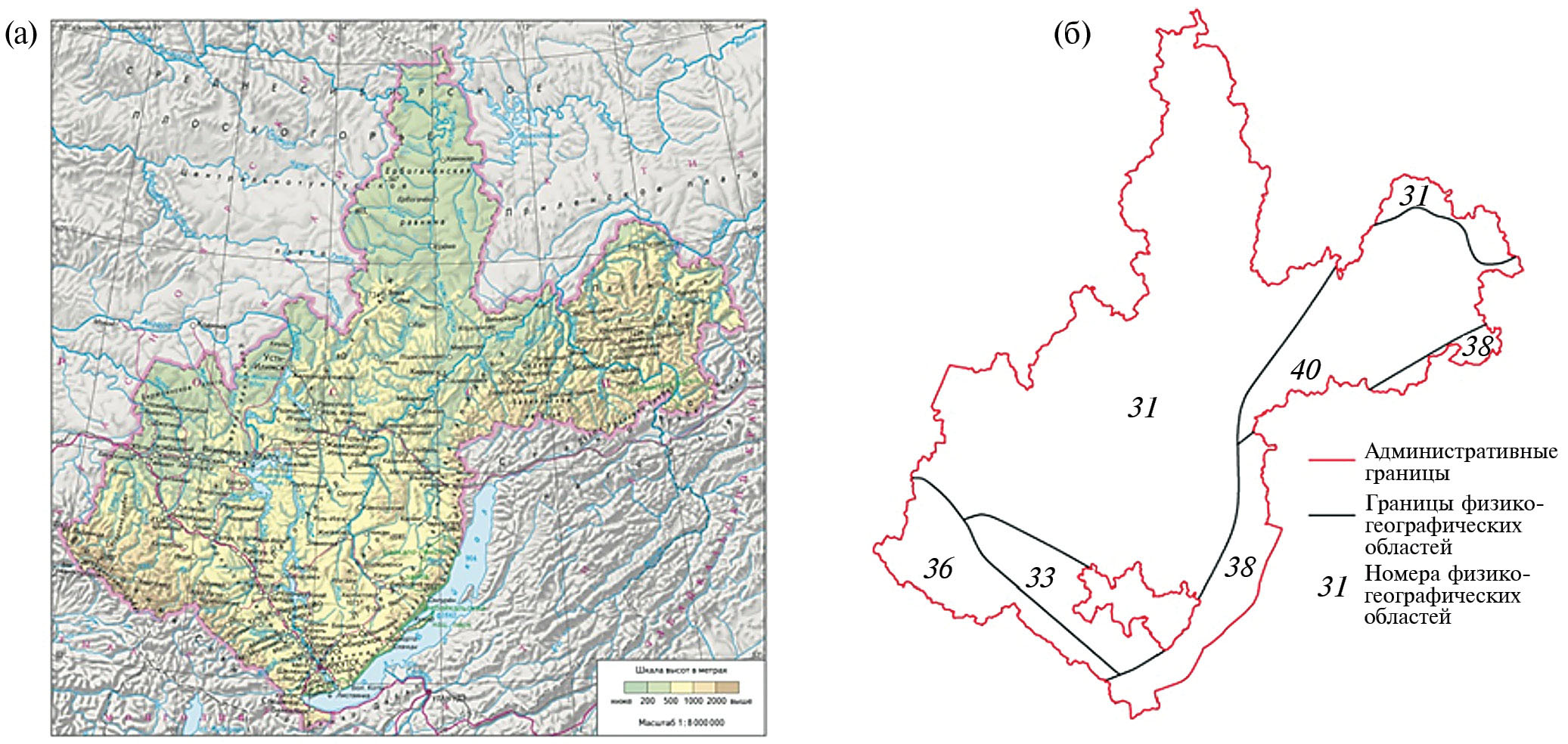 Рис. 2. Физическая карта (а) и границы физико-географических областей (б) Иркутской области (см. табл. 1)