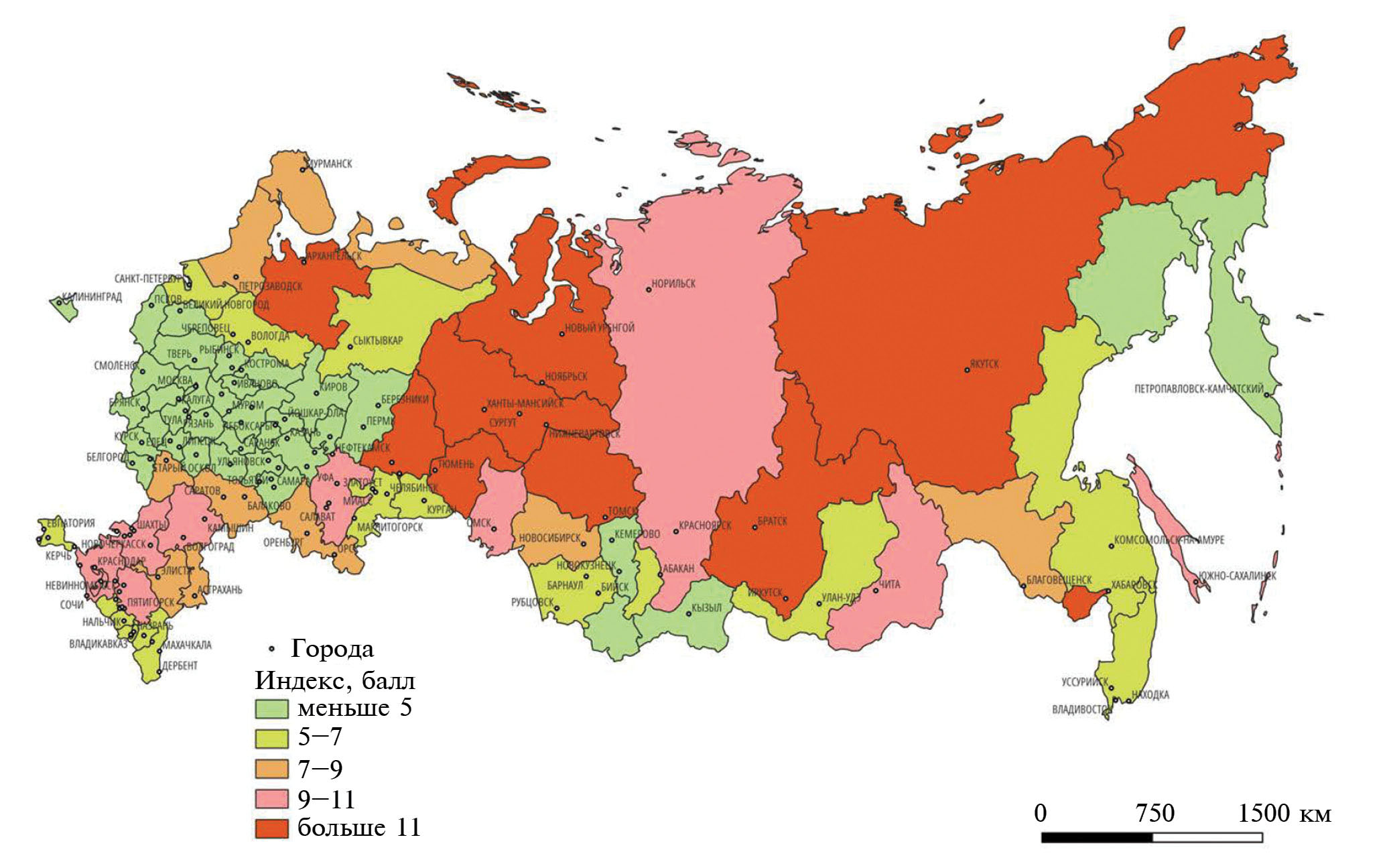 Рис. 3. Индекс благоприятности размещения полигонов ТКО субъектов РФ.