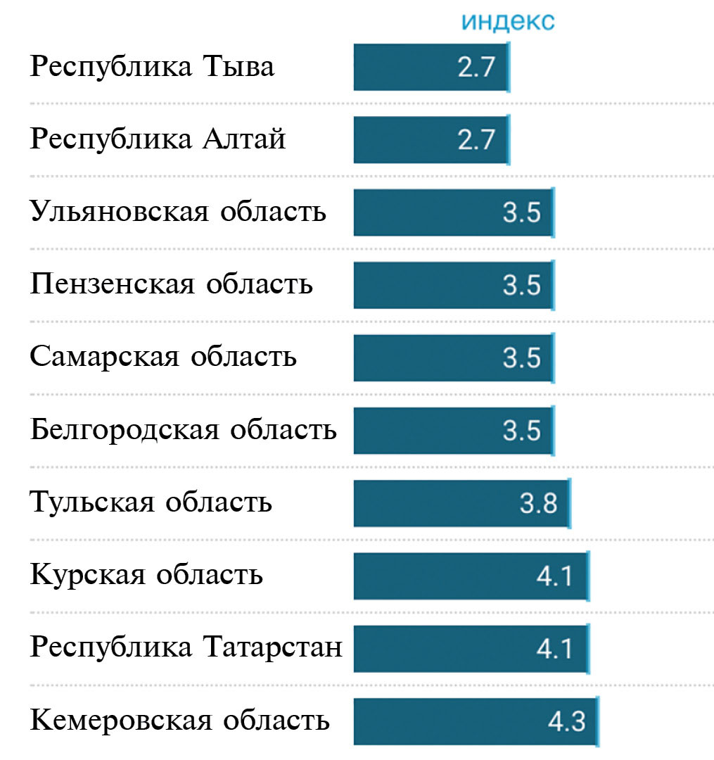 Рис. 4. Топ-10 регионов РФ с минимальными значениями Индекса благоприятности условий для размещения полигонов ТКО.