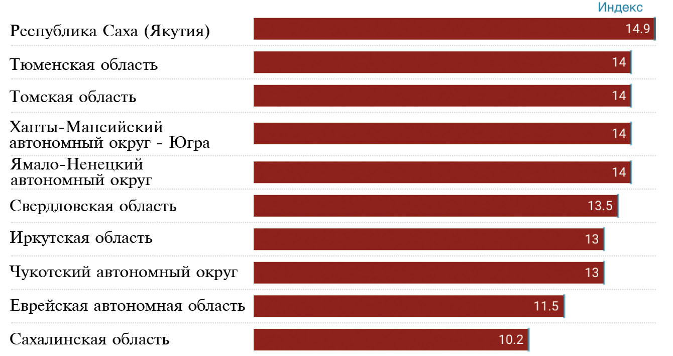 Рис. 5. Топ-10 регионов РФ с максимальными значениями Индекса благоприятности условий для размещения полигонов ТКО.
