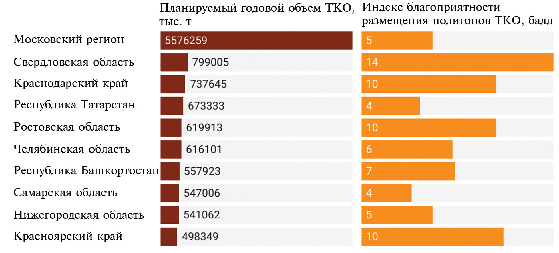 Рис. 6. Топ-10 регионов по распределению нормируемого годового объема ТКО и показатель Индекса благоприятности размещения полигонов ТКО.
