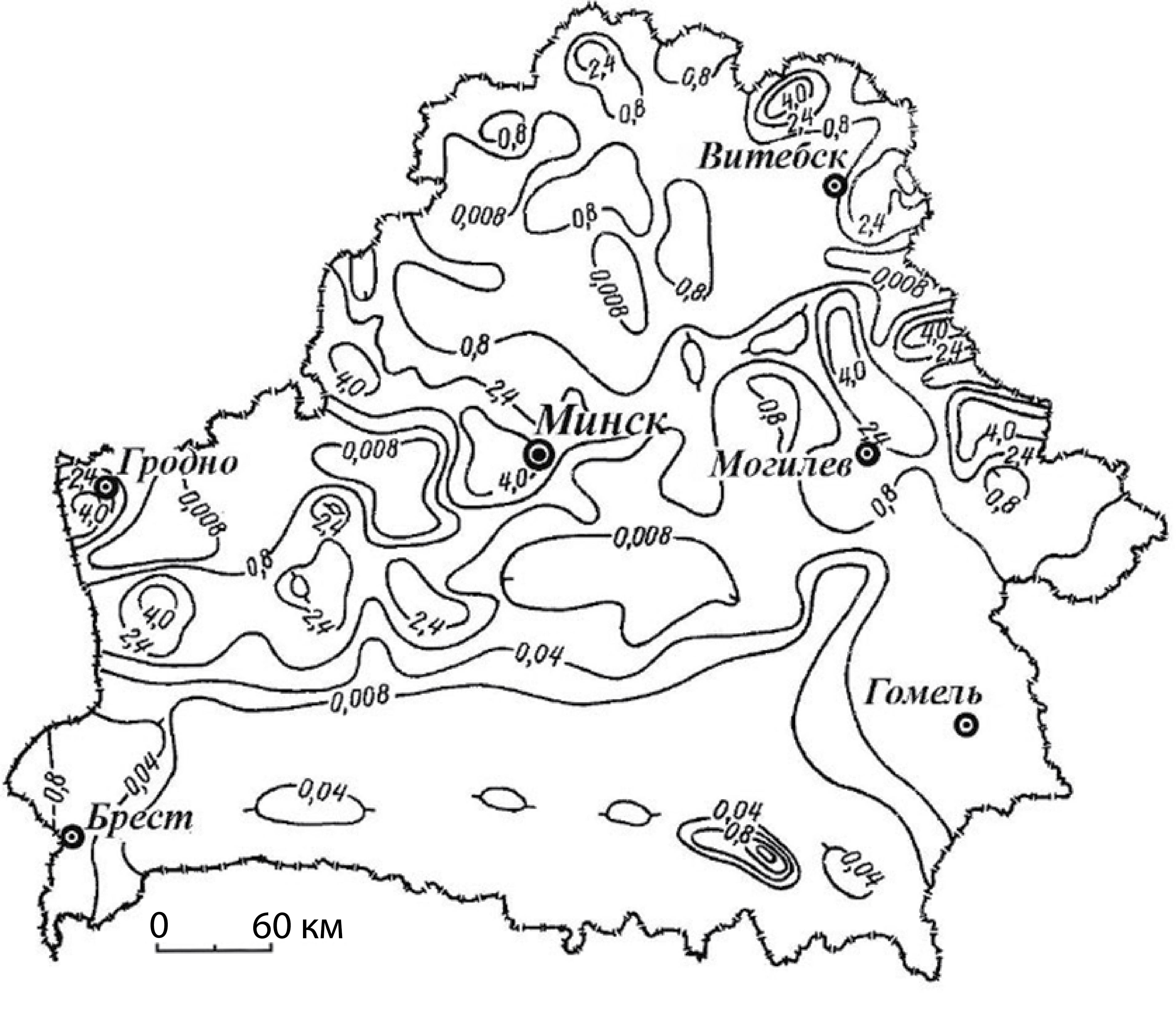 Оценка интенсивности плоскостного смыва на территории Беларуси была выполнена на основании числового моделирования и последующих верификации модели и корректуры вычислительного алгоритма посредством сопоставления расчетных величин с результатами полевых и стационарных наблюдений [25]. Интенсивность смыва с используемых в инженерно-хозяйственных целях земель изменяется от 0.008 до 10.0 мм, составляя в среднем 0.42 мм в год (рис. 4). Максимальные среднегодовые значения плоскостного смыва со склонов (10 мм и более) характерны для краевых ледниковых возвышенностей (Гродненская, Волковысская, Новогрудская, Минская, Оршанская). Рельеф этих территорий в основном холмистоувалистый или грядово-холмистый, осложненный овражно-балочно-долинной сетью с выравненными водораздельными участками, которые занимают менее 20% общей площади. Гидрографическая сеть хорошо разработана. Крутизна склонов достигает 3°–10°, а длина – 0.2–1.0 км. Густота эрозионной сети часто превышает 1 км/км2, а глубина вертикального расчленения изменяется в пределах 20–50 м. Для возвышенностей характерен пестрый вещественный состав отложений, но чаще всего с поверхности залегают легкоразмываемые песчаные, супесчаные и лессовидные отложения. Все эти природные особенности в совокупности с повышенным количеством осадков (более 600 мм) создают условия для интенсивной эрозии.