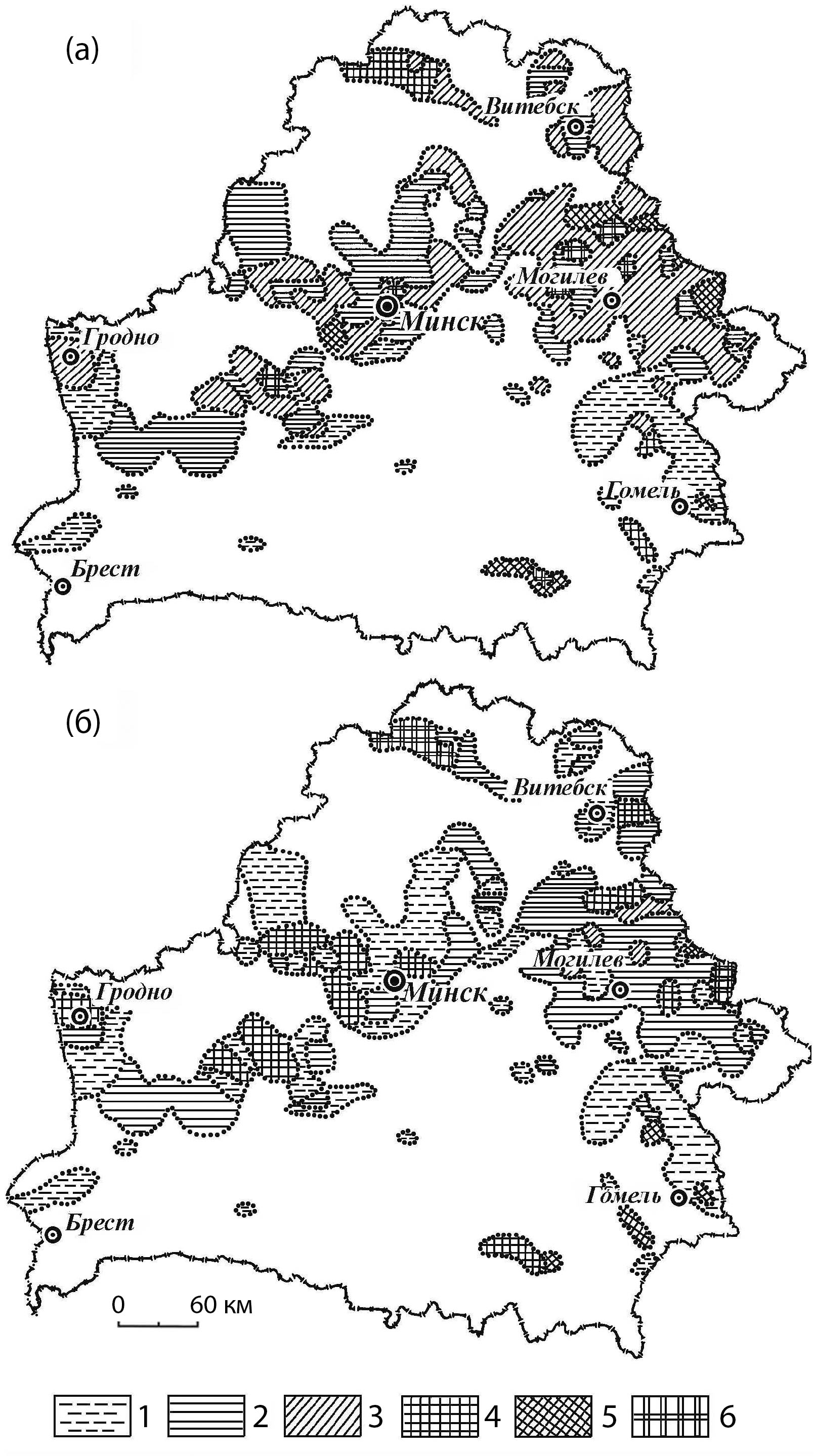 Эрозия и аккумуляция временных русловых потоков развита примерно на 7% территории Белоруссии. Наиболее широко линейная эрозия проявляется в пределах краевых ледниковых возвышенностей – Минской, Новогрудской, Ошмянской, Гродненской, Оршанской, Витебской, Волковысской и др., а также на значительных участках Могилевской и Горецкой равнин и в прибортовых частях крупных речных долин (рр. Днепр, Неман, Западная Двина, Березина, Сож и др.). Это обусловлено прежде всего природными особенностями этих территорий, а именно значительным перепадом высотных отметок на участках различных геоморфологических элементов (до 50 м и более), длиной склонов до 0.2–1.0 км и более, их крутизной 3°–10° и более, пестрым составом покровных отложений с преобладанием легкоразмываемых песков, супесей и лессовидных супесчано-суглинистых образований, значительным количеством осадков в течение года (более 600 мм) и длительным хозяйственным освоением. На этих участках плотность и густота овражно-балочной сети достигают максимальных значений – плотность 4–6 ед./км2, реже до 7–10 ед./км2 (рис. 6а), а густота – 0.7–0.9 км/км2 (рис. 6б), на отдельных площадях Новогрудской и Мозырской возвышенностях до 5–7 км/км2. В наименьшей степени эрозии временных водотоков подвержены участки Загородья, Высоковской и Чечерской равнин, где плотность эрозионных форм не превышает 1 ед./км2, а густота эрозионной сети измеряется 0.1–0.4 км/км2, в то время как на остальной территории с распространением овражно-балочного рельефа эти показатели составляют 1–2 ед./км2 и 0.4–0.5 км/км2 соответственно.