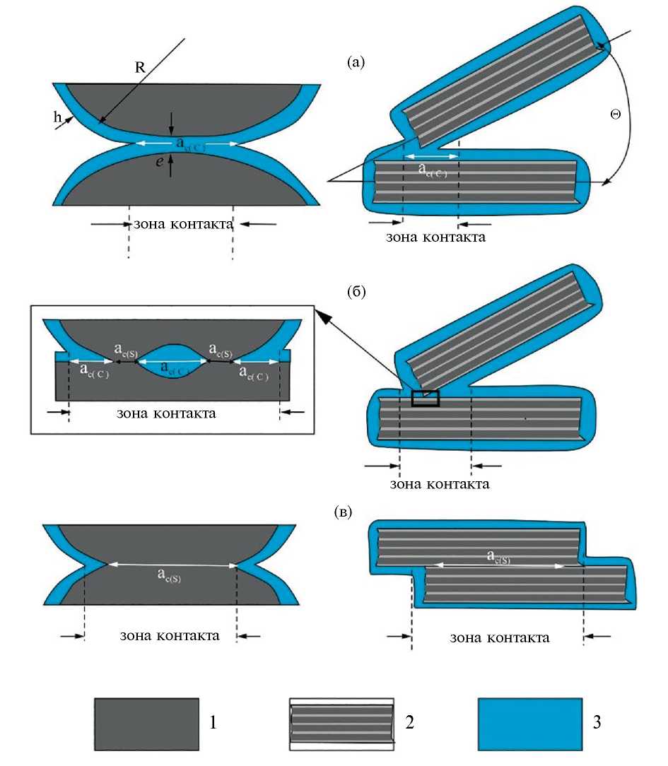 Второй тип контактов (рис. 9б) формируется по мере уплотнения глинистых пород в водонасыщенном состоянии или их частичного обезвоживания при высушивании. Под влиянием внешних и внутренних факторов на отдельных неровностях (выступах) контактирующих поверхностей происходит продавливание (разрушение) гидратных граничных пленок. В результате на небольших площадках непосредственного соприкосновения частиц образуются точечные контакты (по терминологии П.А. Ребиндера), за счет “холодной спайки” частиц или образования ионно-электростатических связей, подобно тем, какие существуют между слоями в структурах глинистых минералов. Поскольку поведение таких контактов определяется как расклинивающим действием гидратных пленок (на коагуляционных участках контакта), так и более прочными силами химической и ионно-электростатической природы (на участках непосредственного соприкосновения частиц), то они были названы смешанными (или переходными) [18]. Образованию переходных контактов способствует неоднородность микрорельефа поверхности дисперсных минеральных частиц: на выступах водные пленки могут прорываться с образованием участков с фазовыми контактами, а в углублениях, наоборот, сохраняются коагуляционные участки. Расчеты показывают, что прочность единичного переходного контакта может изменяться от 5 × 10–8 до 3 × 10–7 Н [24].