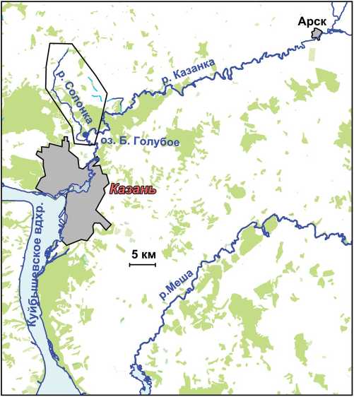 Казань расположена на левобережье Куйбышевского водохранилища, в восточной части Русской равнины. Площадь города составляет около 600 км2, население – 1.3 млн человек. Расположение города у крупнейшего в Европе водохранилища и в области достаточного увлажнения определяет значительные ресурсы поверхностных и пресных подземных вод. Площадь города делится примерно на две равные части долиной р. Казанка, впадающей в водохранилище. В городской черте находятся и некоторые притоки Казанки – реки Нокса, Киндерка, Сухая, Солонка, а также около 280 озерных водоемов [16]. Наиболее крупными, широко известными и используемыми в первую очередь в рекреационных целях, являются озера Кабан, Лебяжье, Глубокое, Изумрудное и др.