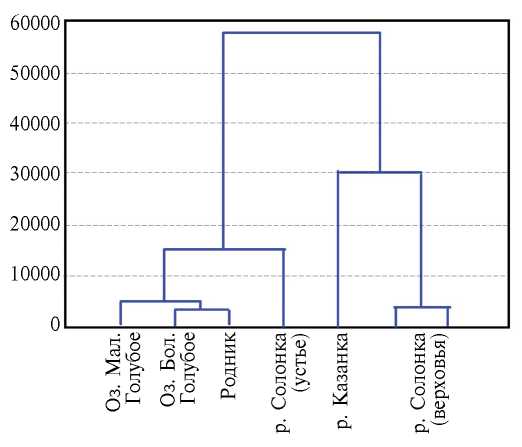 Рис. 4. Кластер-диаграмма связей разнотипных водопроявлений (7 проб, мера связи – Евклидово расстояние).