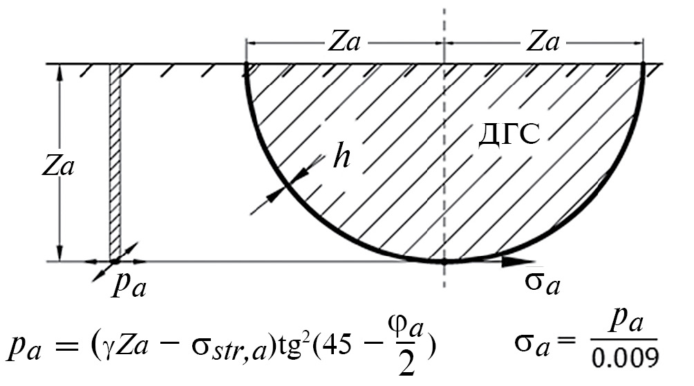 где σa – давление в грунте оболочки ДГС на глубине Za – радиусе кривизны оболочки; h – толщина оболочки ДГС.
