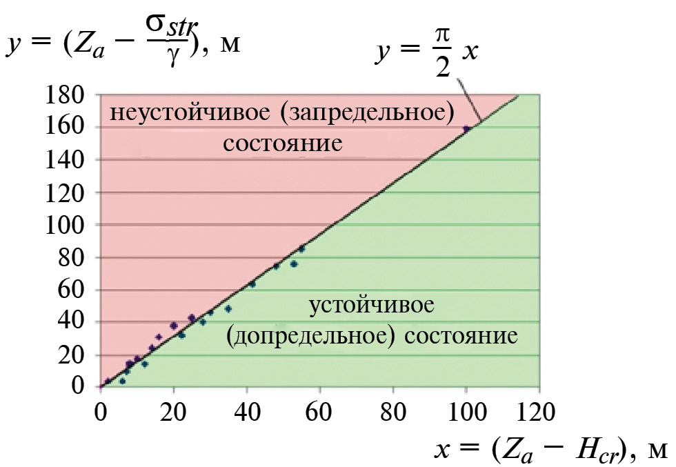 Из (3) следует, что в предельном состоянии давление в грунтах на уровне базиса в оползневой части ДГС в π / 2 раз меньше, чем в коренном залегании. Коэффициент π / 2 = (γZа − σstr,a) / γ (Zа – Hcr) отражает универсальное значение уравнения предельного состояния для любых исходных геологических и геоморфологических условях (рис. 3).